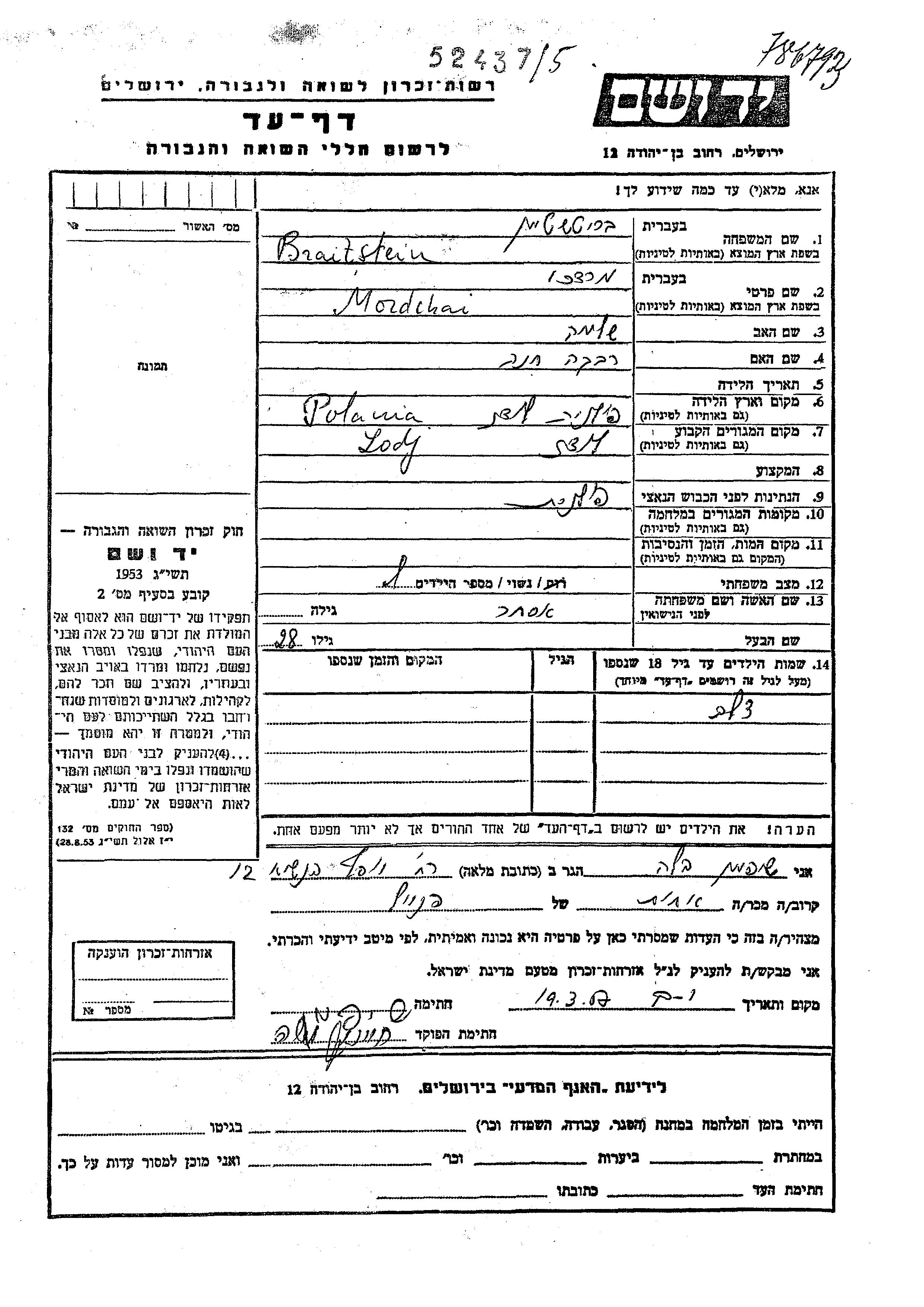 Mordchai Braitstein Britshtein wurde in Lodz, Polen geboren. Er war der Sohn von Shlomo und Rivka Khana. Er war mit Ester Verheiratet. Vor dem Zweiten Weltkrieg lebte er in Lodz, Polen.