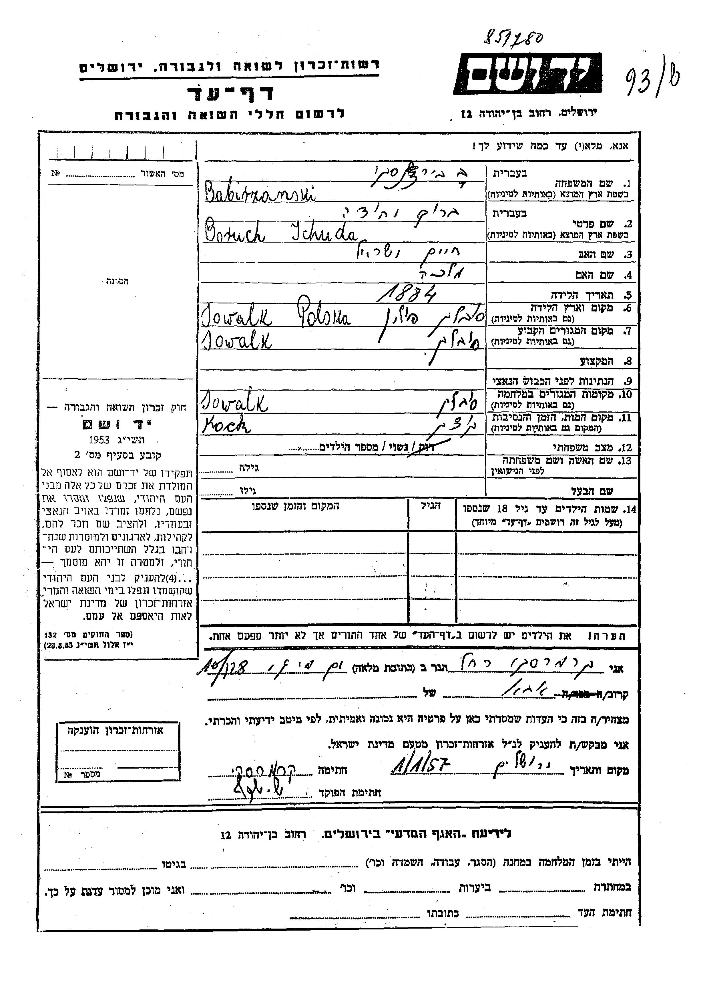 Boruch Jchuda Babirzanski wurde im Jahr 1884 in Sowalk, Polen geboren. Er war der Sohn von Khaim Yisrael und Malka. Er war Ledig. Vor dem Zweiten Weltkrieg lebte er in Sowalk, Polen. Während des Krieges war er in Sowalk, Polen.