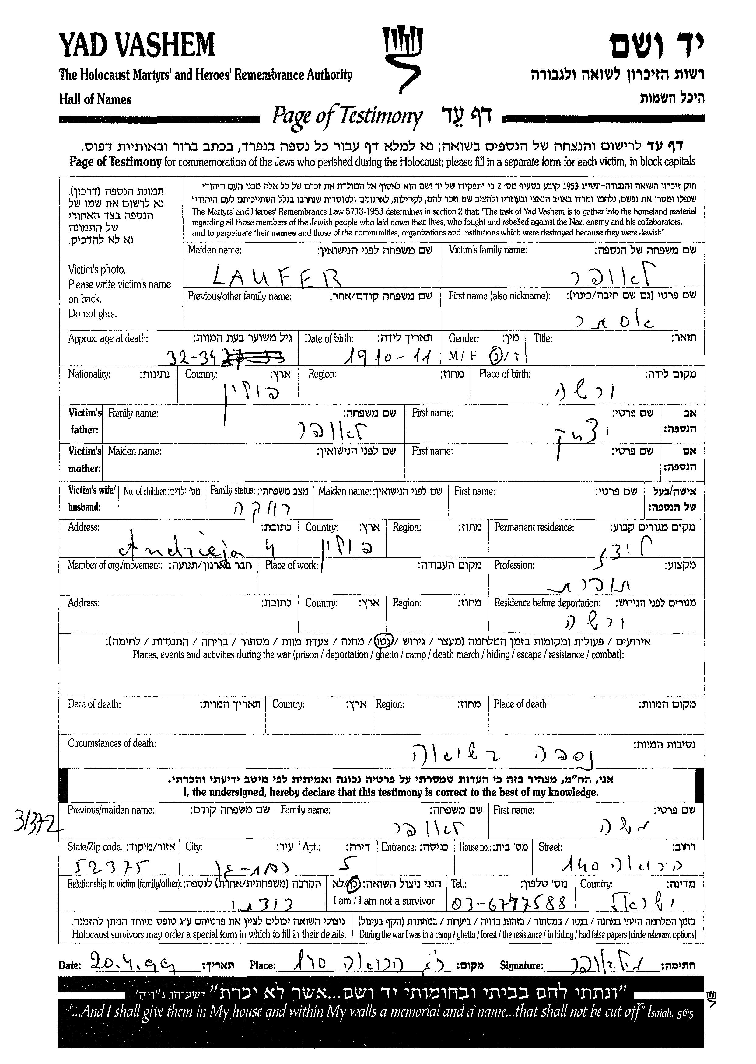 Ester Laufer wurde im Jahr 1910 in Warszawa, Polen geboren. Sie war die Tochter von Yitzkhak. Sie war Schneiderin und Ledig. Vor dem Zweiten Weltkrieg lebte sie in Lodz, Polen. Während des Krieges war sie in Warszawa, Polen.