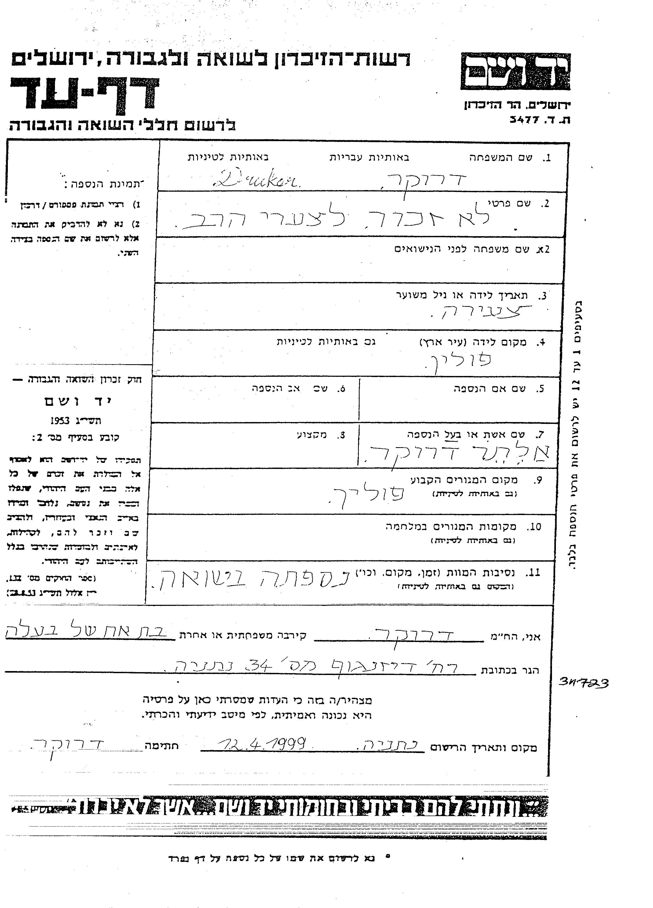 Vorname unbekannt Druker wurde in Polen geboren. Sie war mit Alter Verheiratet. Vor dem Zweiten Weltkrieg lebte sie in Polen.