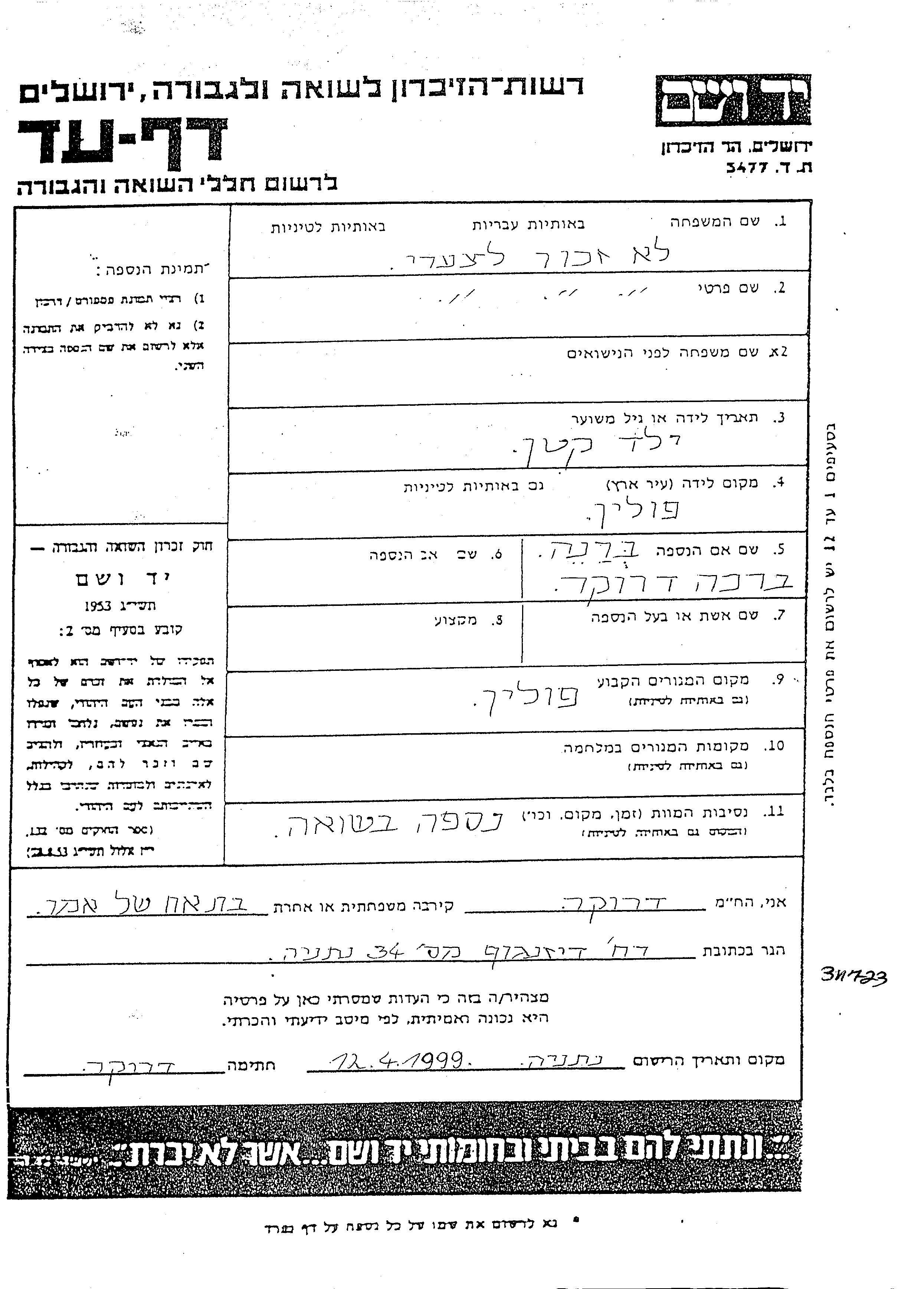 Vorname unbekannt Name unbekannt wurde in Polen geboren. Er war der Sohn von Brana Brakha. Er war Kind. Vor dem Zweiten Weltkrieg lebte er in Polen.