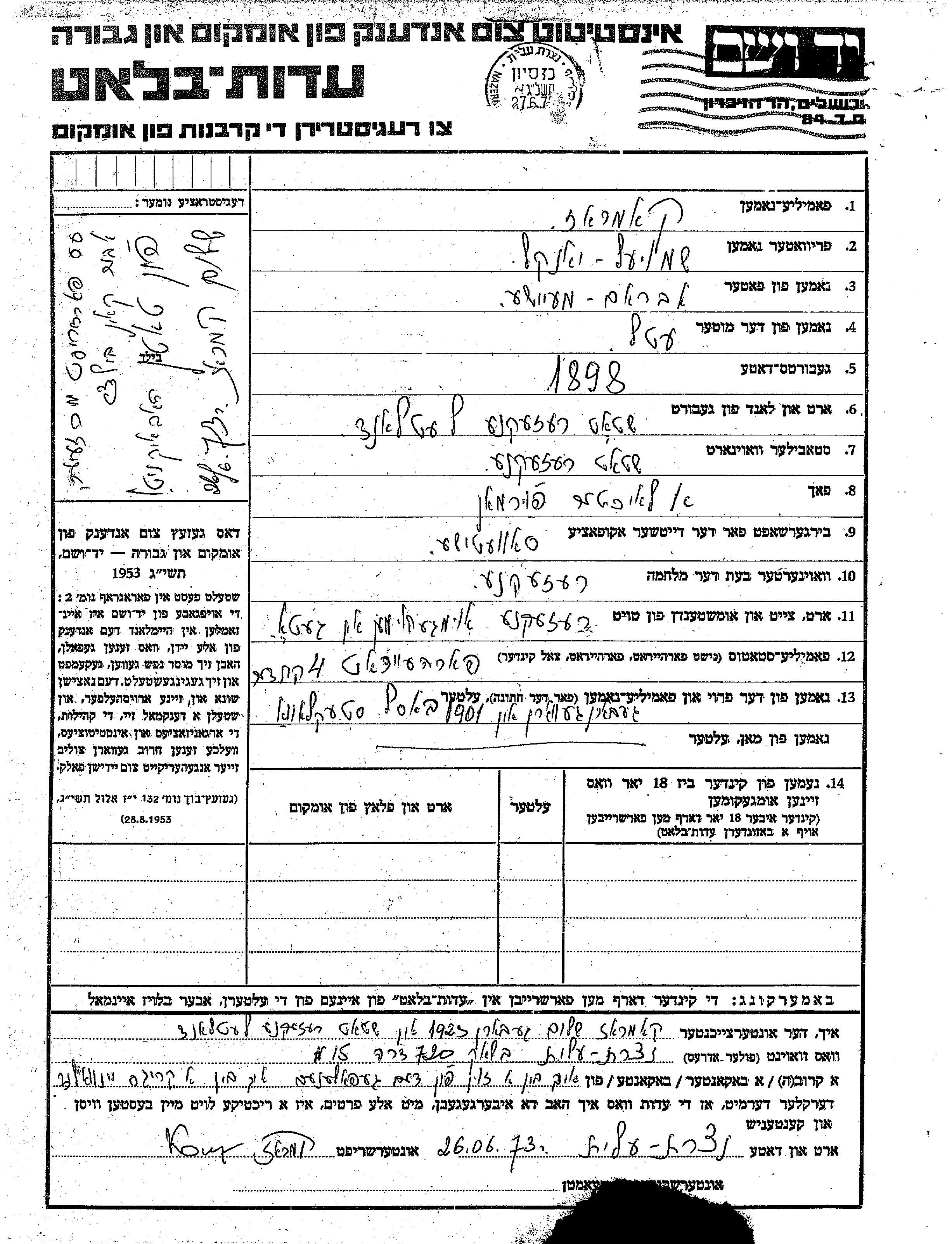 Shmuel Yaakov wurde in der Schoah ermordet. Todesort: Rēzekne, Lettland.