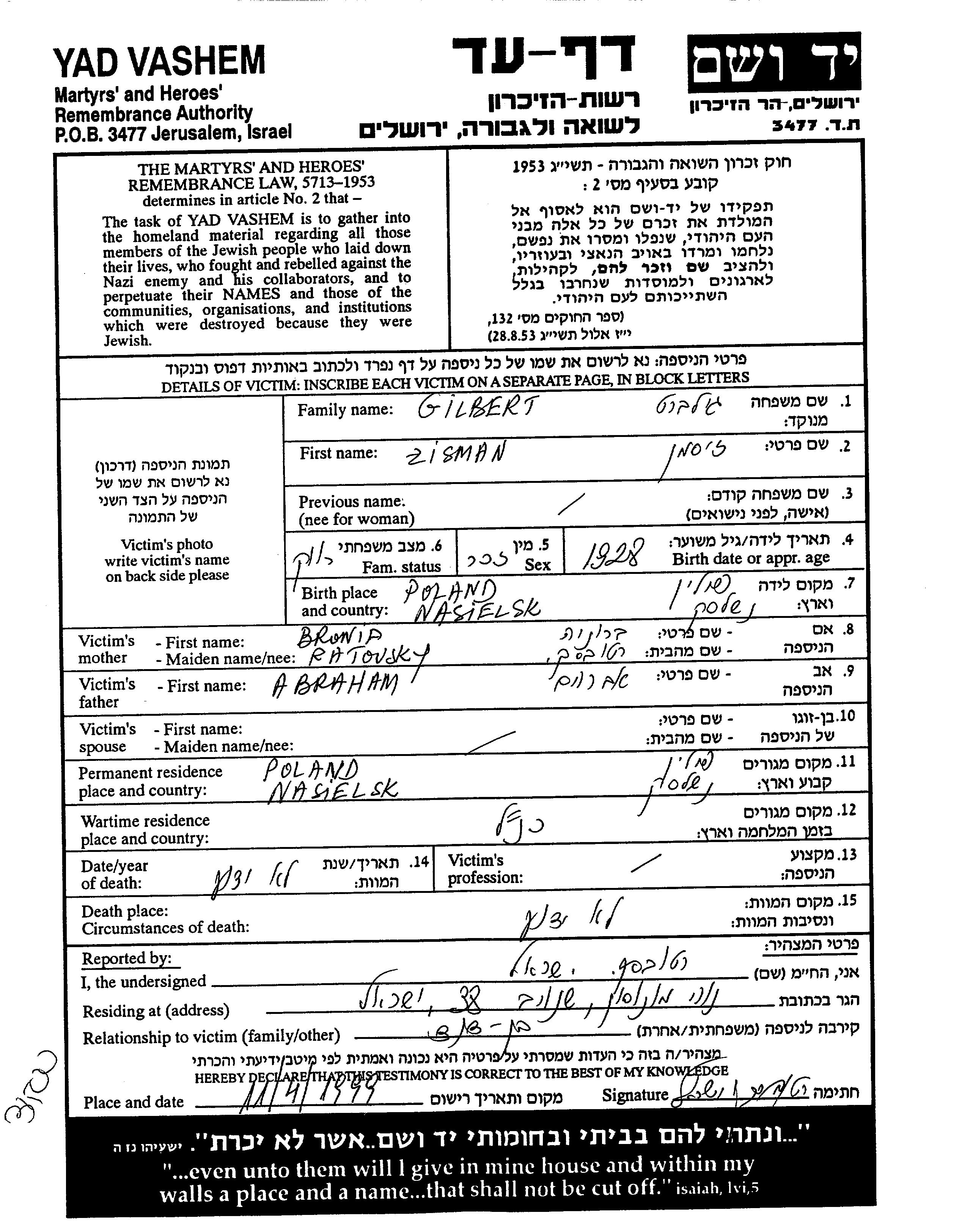 Gilbert Zisman 1928 Nasielsk, Polen Gedenkblatt