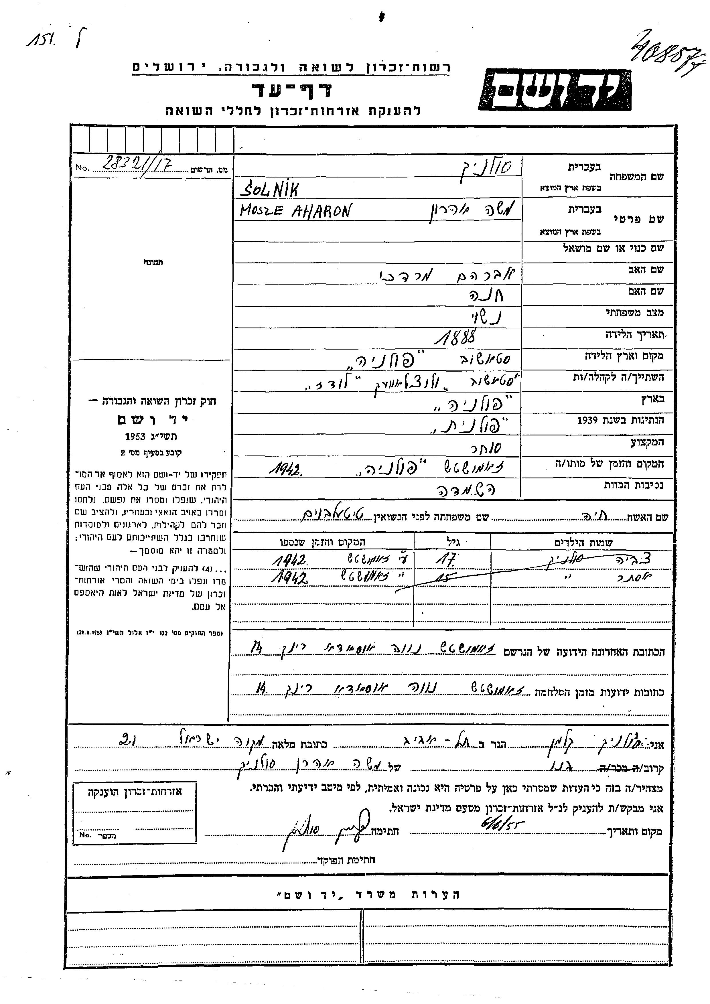 Mosze Aharon Solnik wurde im Jahr 1888 in Staszow, Polen geboren. Er war der Sohn von Avraham Mordekhai und Khana. Er war Kaufmann/-frau und mit Khaia, geb. Teitelbaum Verheiratet. Vor dem Zweiten Weltkrieg lebte er in Staszow, Polen. Während des Krieges war er in Zamosc, Polen.