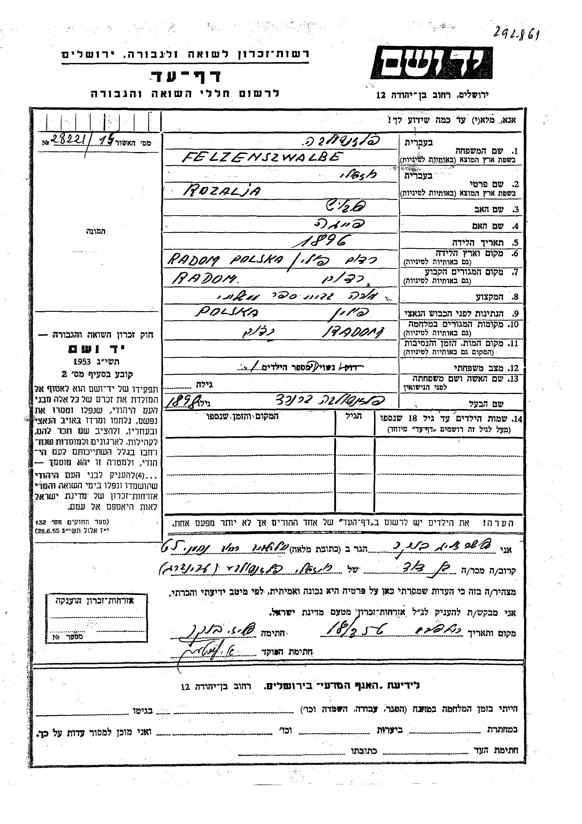 Rozalja Felzenszwalbe wurde im Jahr 1896 in Radom, Polen geboren. Sie war die Tochter von Feibush und Feiga. Sie war Lehrer/in und mit Bernard Verheiratet. Vor dem Zweiten Weltkrieg lebte sie in Radom, Polen. Während des Krieges war sie in Radom, Polen.