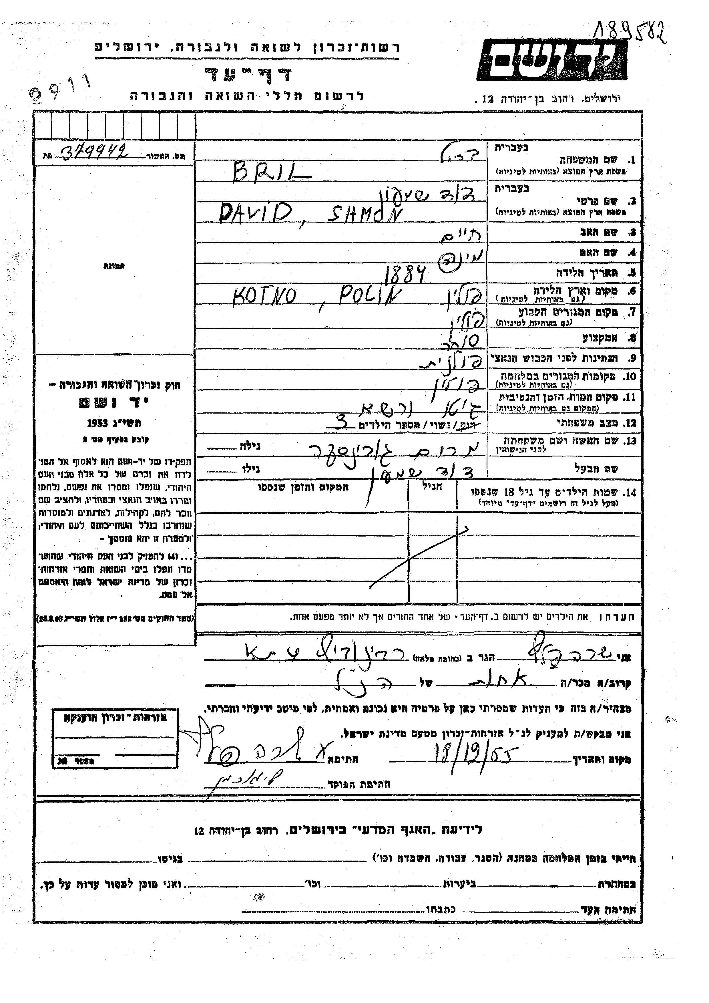 Shmon David Bril wurde im Jahr 1884 in Kutno, Polen geboren. Er war der Sohn von Khaim und Mina. Er war Kaufmann/-frau und mit Miriam, geb. Gorin Verheiratet. Vor dem Zweiten Weltkrieg lebte er in Polen. Während des Krieges war er in Polen.