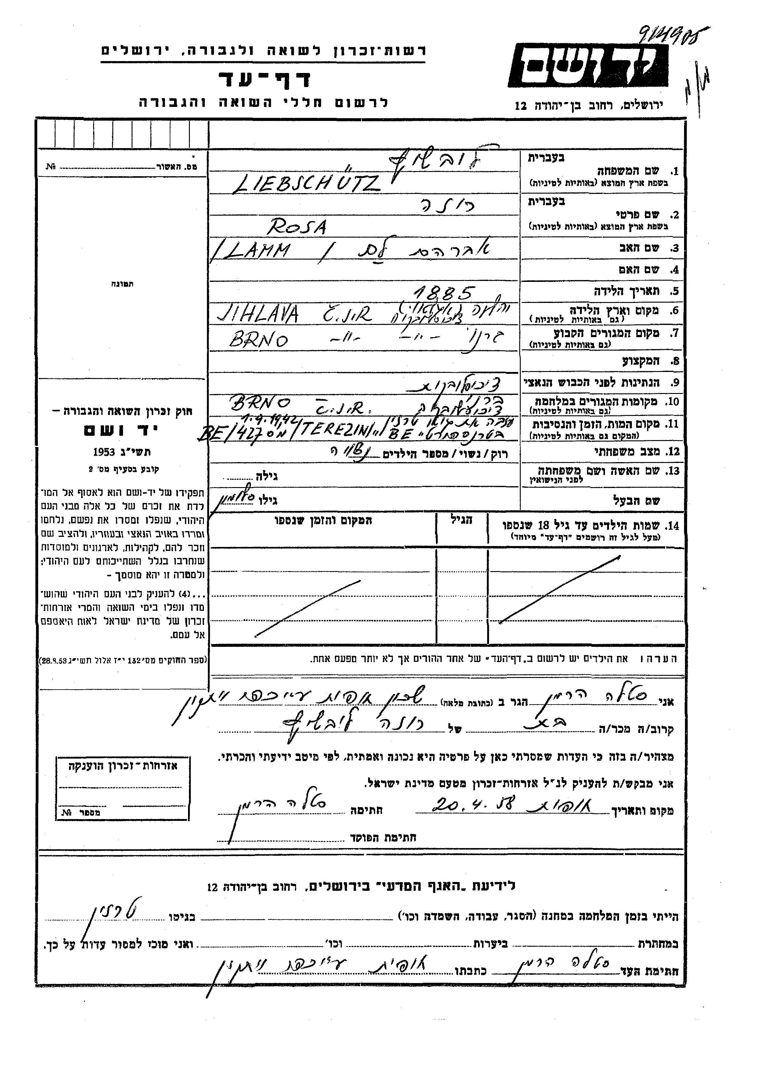 Rosa Liebschütz Lobshitz, geb. Lamm wurde im Jahr 1885 in Jihlava, Tschechoslowakei geboren. Sie war die Tochter von Avraham. Sie war mit Salomon Verheiratet. Vor dem Zweiten Weltkrieg lebte sie in Brno, Tschechoslowakei. Während des Krieges war sie in Brno, Tschechoslowakei.