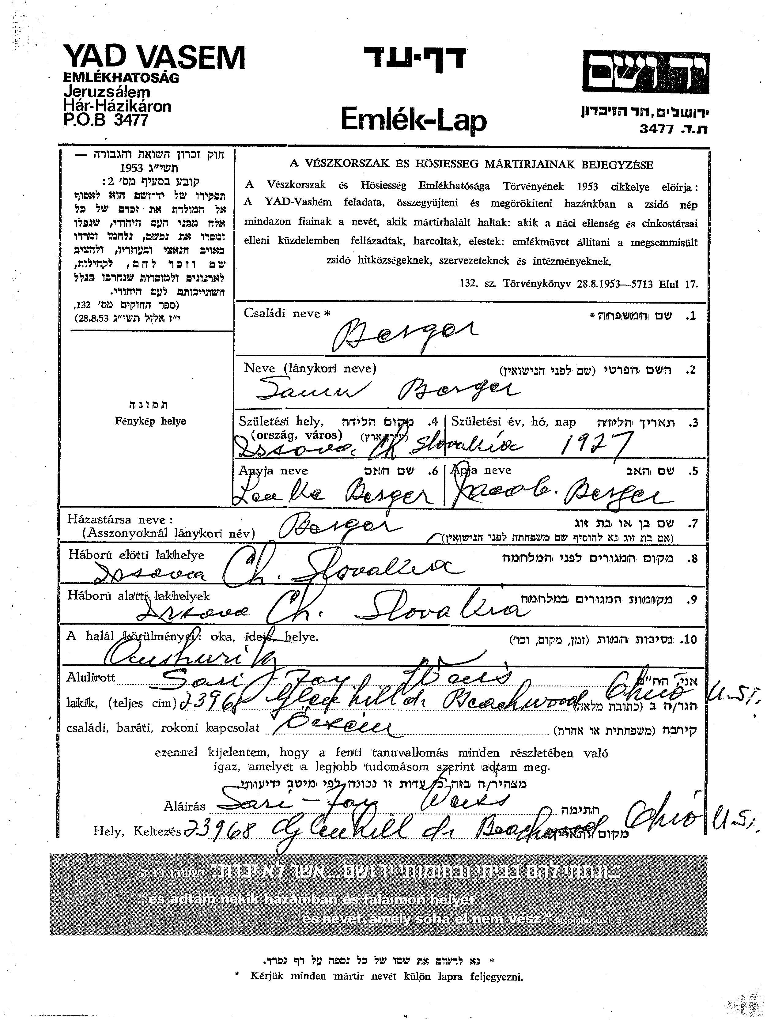 Samu Berger wurde im Jahr 1927 in Irsava, Tschechoslowakei geboren. Er war der Sohn von Jacob und Lea. Er war Ledig. Vor dem Zweiten Weltkrieg lebte er in Irsava, Tschechoslowakei. Während des Krieges war er in Irsava, Tschechoslowakei.