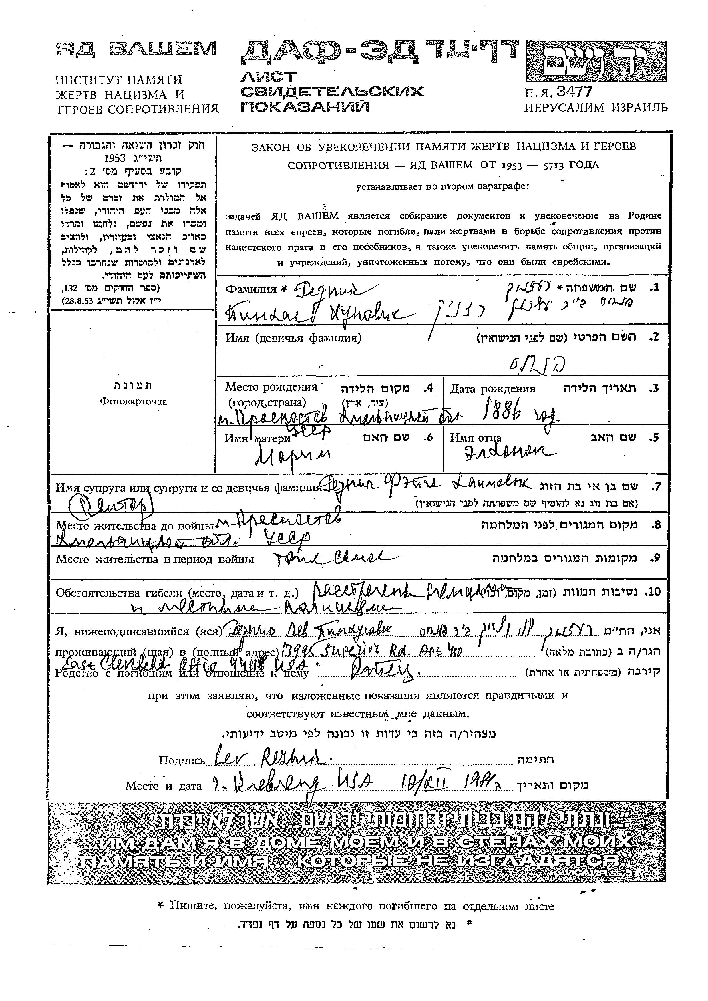 Pinhas Reznik wurde im Jahr 1886 in Krasnostav, Ukraine (UdSSR) geboren. Er war der Sohn von Elkhanan und Marim. Er war mit Feiga, geb. Rektor Verheiratet. Vor dem Zweiten Weltkrieg lebte er in Krasnostav, Ukraine (UdSSR). Während des Krieges war er in Krasnostav, Ukraine (UdSSR).