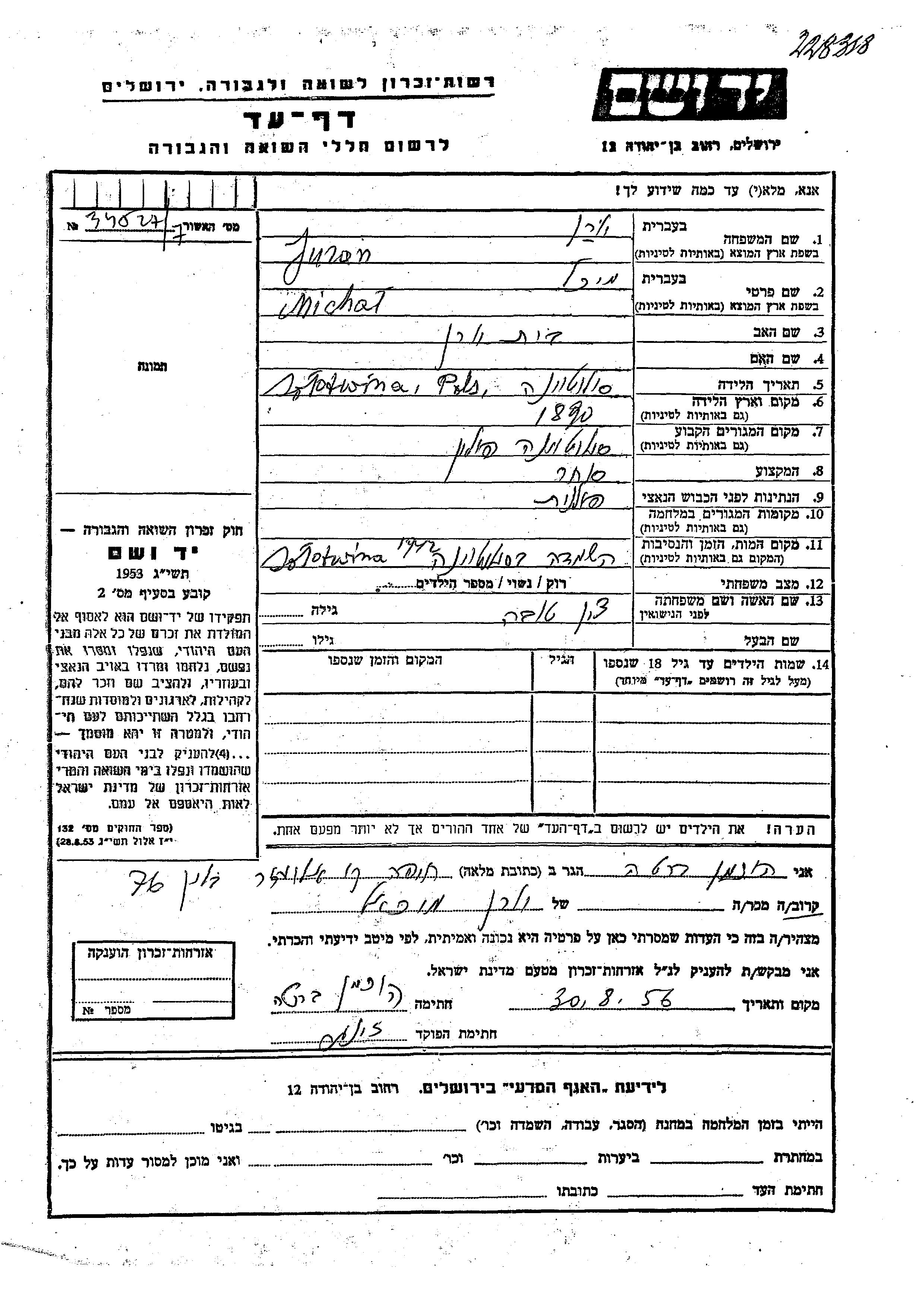Michal Mikhal Juran wurde im Jahr 1890 in Solotwina, Polen geboren. Er war Kaufmann/-frau und mit Tova, geb. Tzin Verheiratet. Vor dem Zweiten Weltkrieg lebte er in Solotwina, Polen.