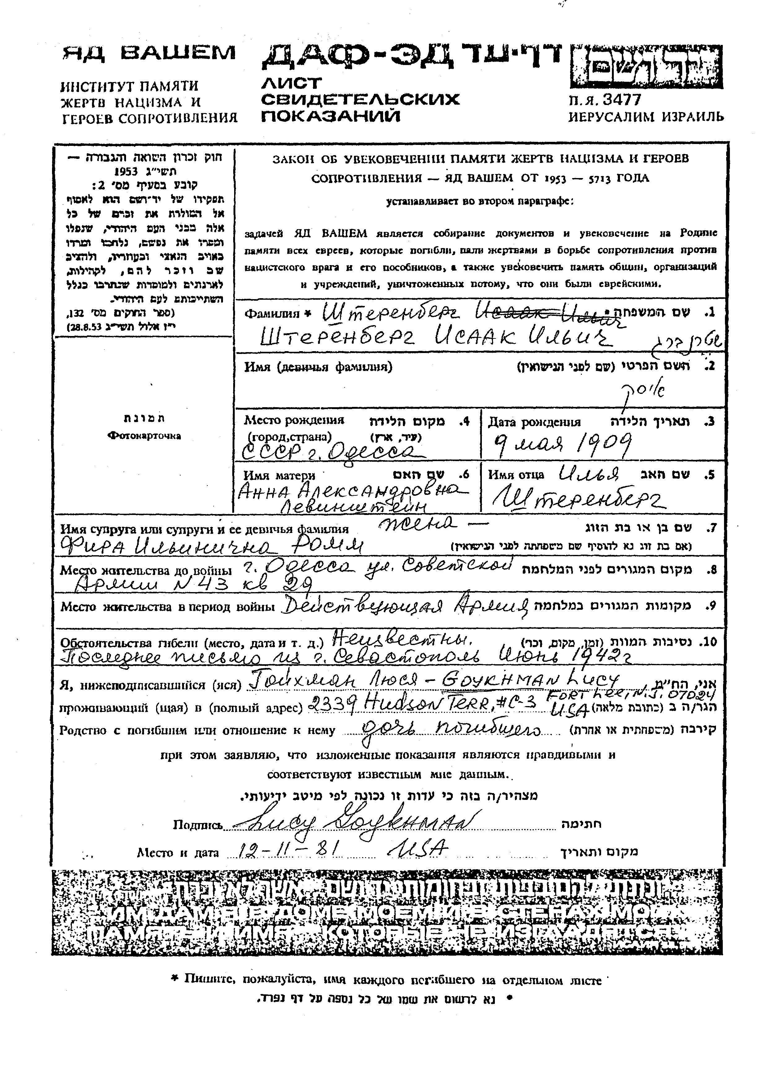 Isaak Shterenberg wurde im Jahr 1909 in Odessa, Ukraine (UdSSR) geboren. Er war der Sohn von Ilia und Anna. Er war mit Fira, geb. Romm Verheiratet. Vor dem Zweiten Weltkrieg lebte er in Odessa, Ukraine (UdSSR). Während des Krieges war er in die Sowjetischen Streitkräfte.
