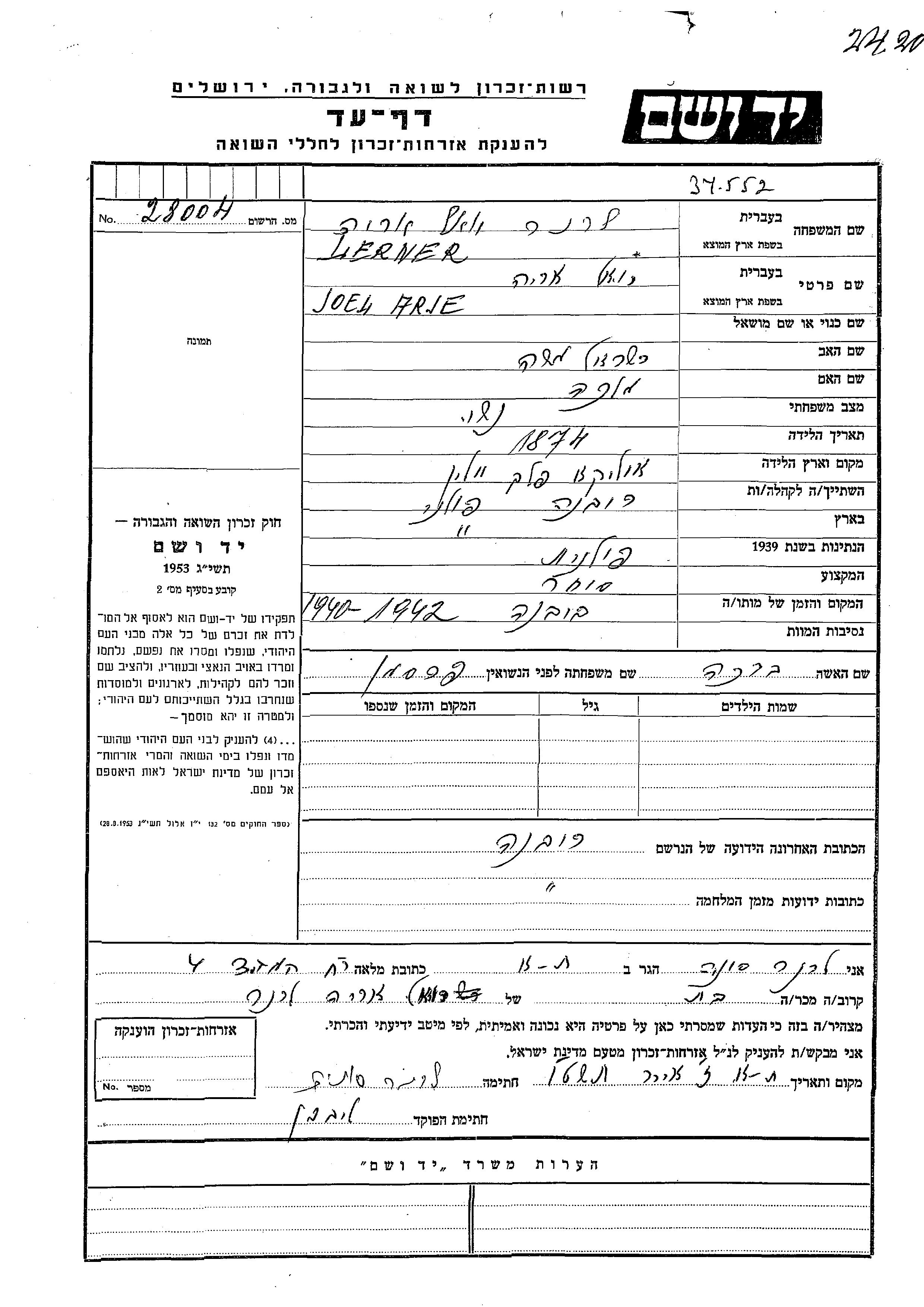 Joel Arja Lerner wurde im Jahr 1874 in Olika, Polen geboren. Er war der Sohn von Yisrael Moshe und Malka. Er war Kaufmann/-frau. Vor dem Zweiten Weltkrieg lebte er in Rowne, Polen. Während des Krieges war er in Rowne, Polen.
