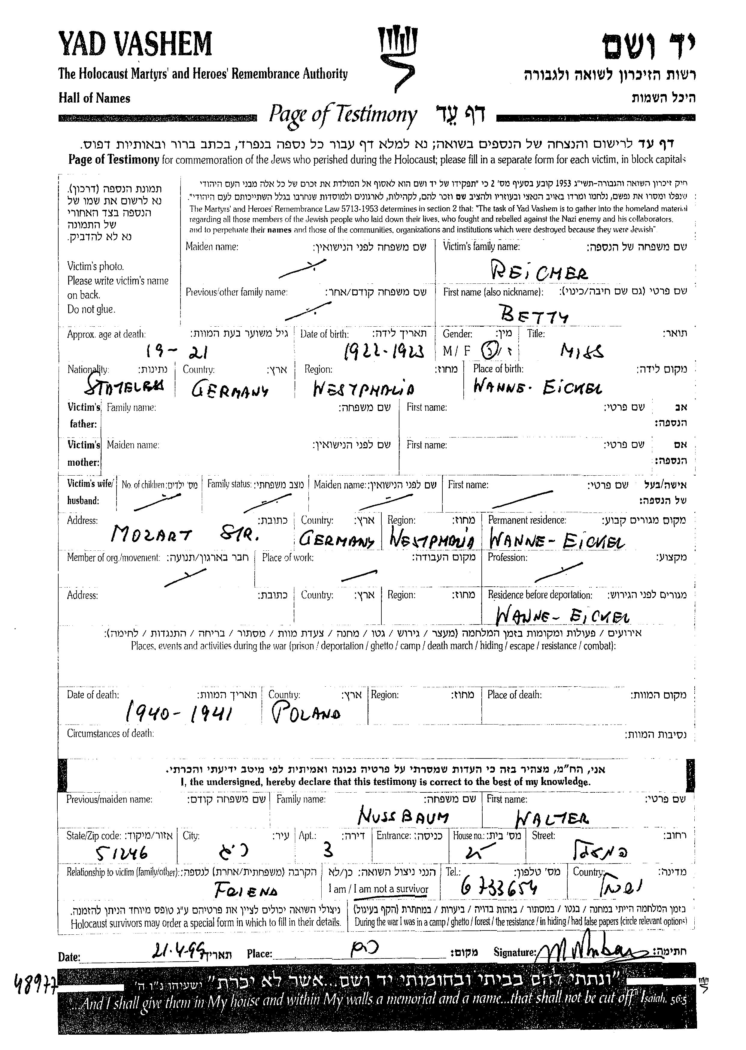 Betty wurde in der Schoah ermordet. Todesort: Polen im Jahr 1940.