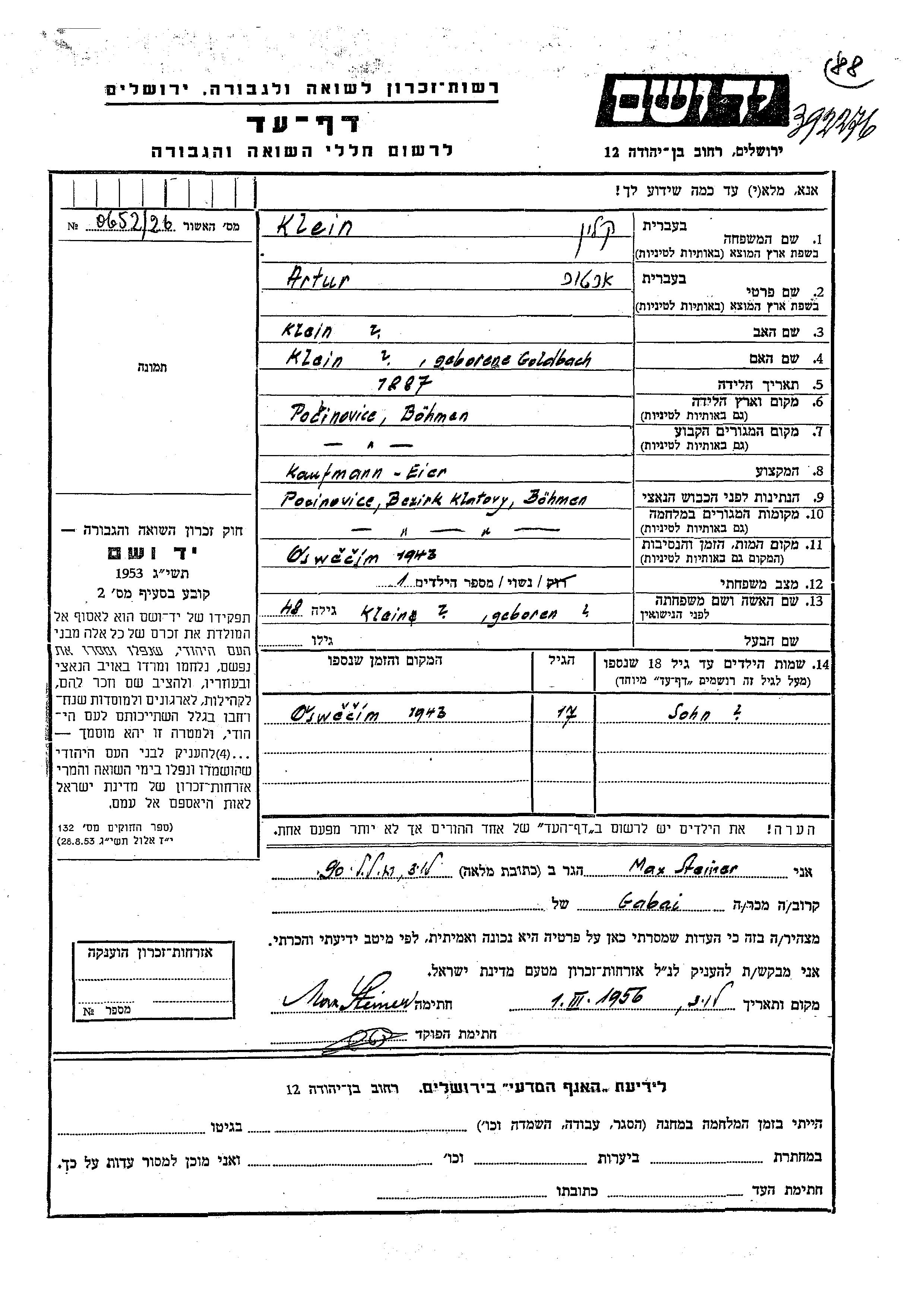 Artur wurde in der Schoah ermordet. Todesort: Oświęcim, Polen im Jahr 1943.