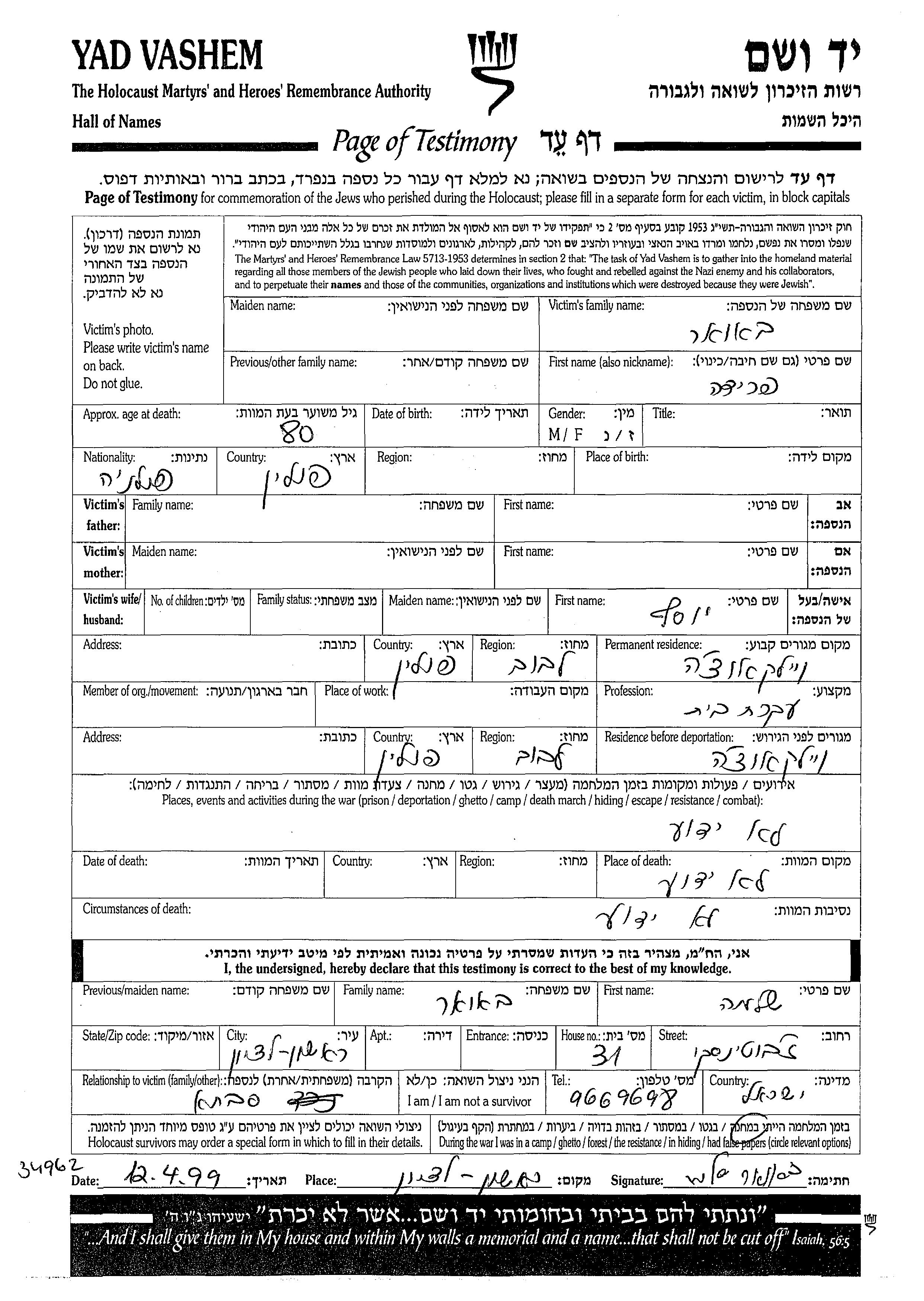 Frida Bauer wurde in Polen geboren. Sie war Hausfrau und mit Yosef Verheiratet. Vor dem Zweiten Weltkrieg lebte sie in Wieliczka, Polen. Während des Krieges war sie in Wieliczka, Polen.