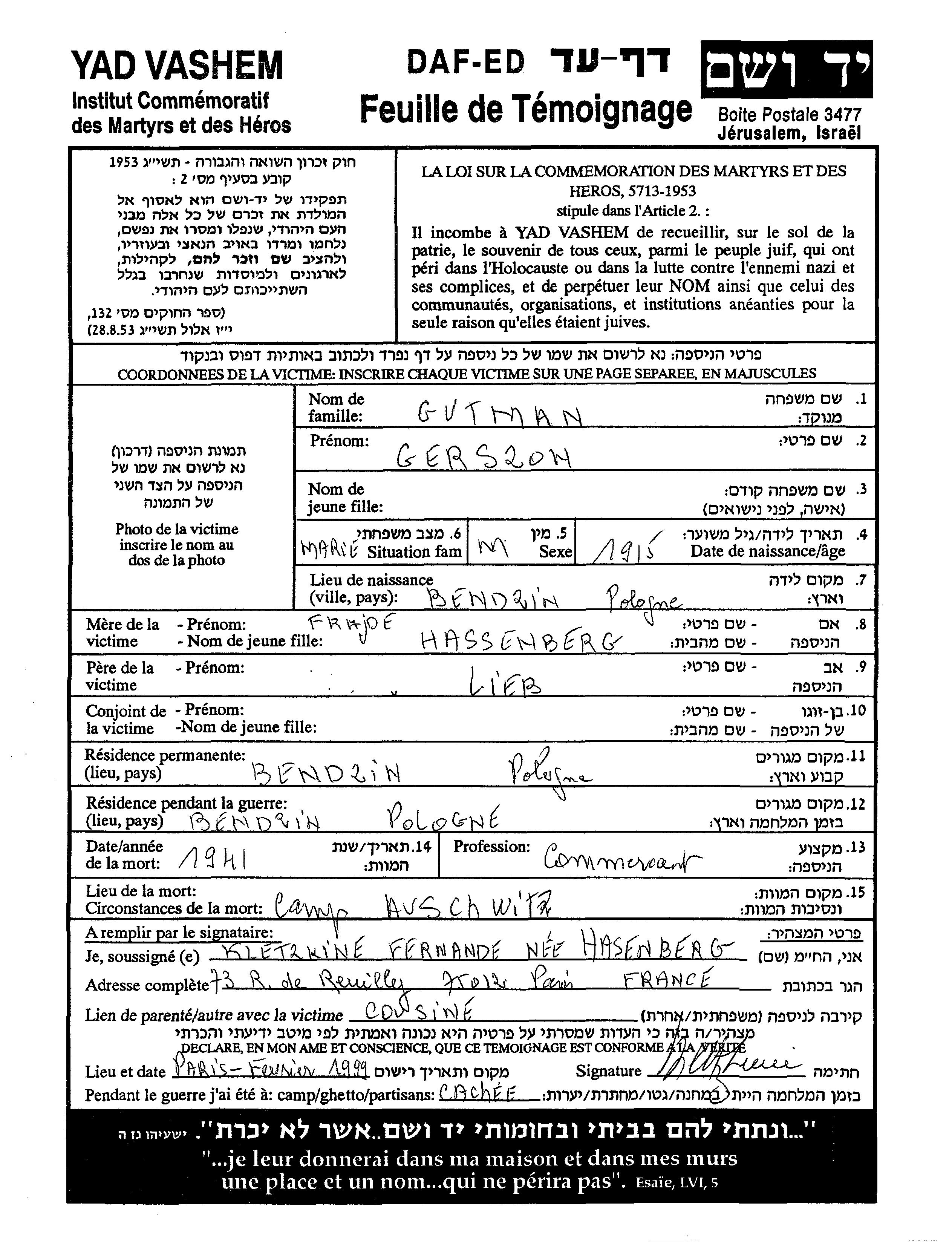 Gerszon Gutman wurde im Jahr 1915 in Bendzin, Polen geboren. Er war der Sohn von Lieb und Frajde. Er war Kaufmann/-frau und Verheiratet. Vor dem Zweiten Weltkrieg lebte er in Bendzin, Polen. Während des Krieges war er in Bendzin, Polen.