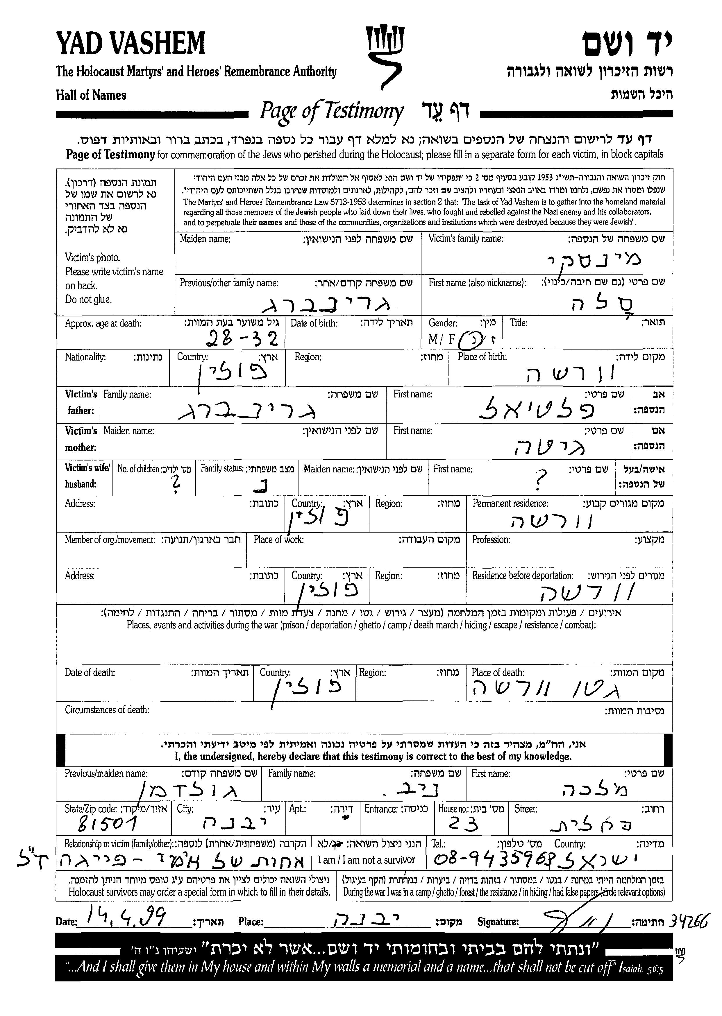 Sala Minski, geb. Grinberg wurde in Warszawa, Polen geboren. Sie war die Tochter von Paltiel und Gita. Sie war Verheiratet. Vor dem Zweiten Weltkrieg lebte sie in Warsaw, Polen. Während des Krieges war sie in Warsaw, Polen.