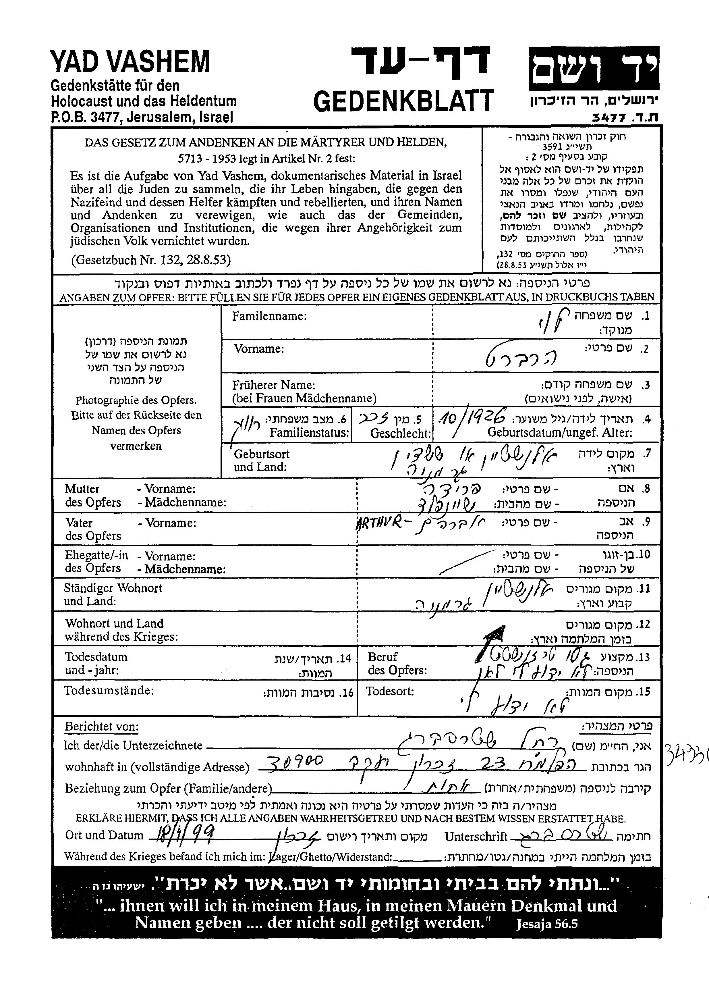 Herbert Levi wurde im Jahr 1926 in Allenstein, Deutsches Reich geboren. Er war der Sohn von Arthur Avraham und Frida. Er war Ledig. Vor dem Zweiten Weltkrieg lebte er in Allenstein, Deutsches Reich. Während des Krieges war er in Theresienstadt, Tschechoslowakei.