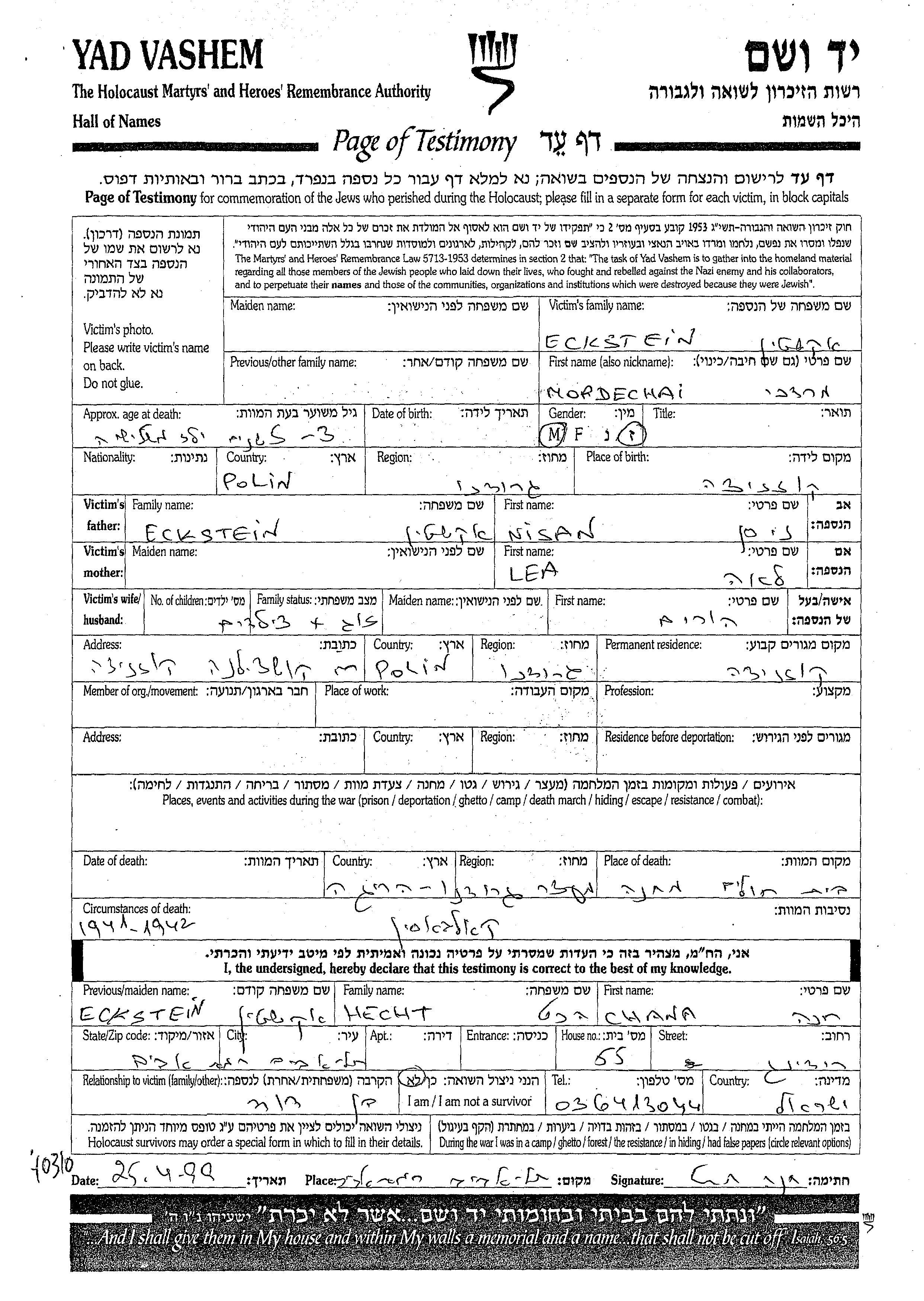 Mordechai wurde in der Schoah ermordet. Todesort: Grodno, Polen.