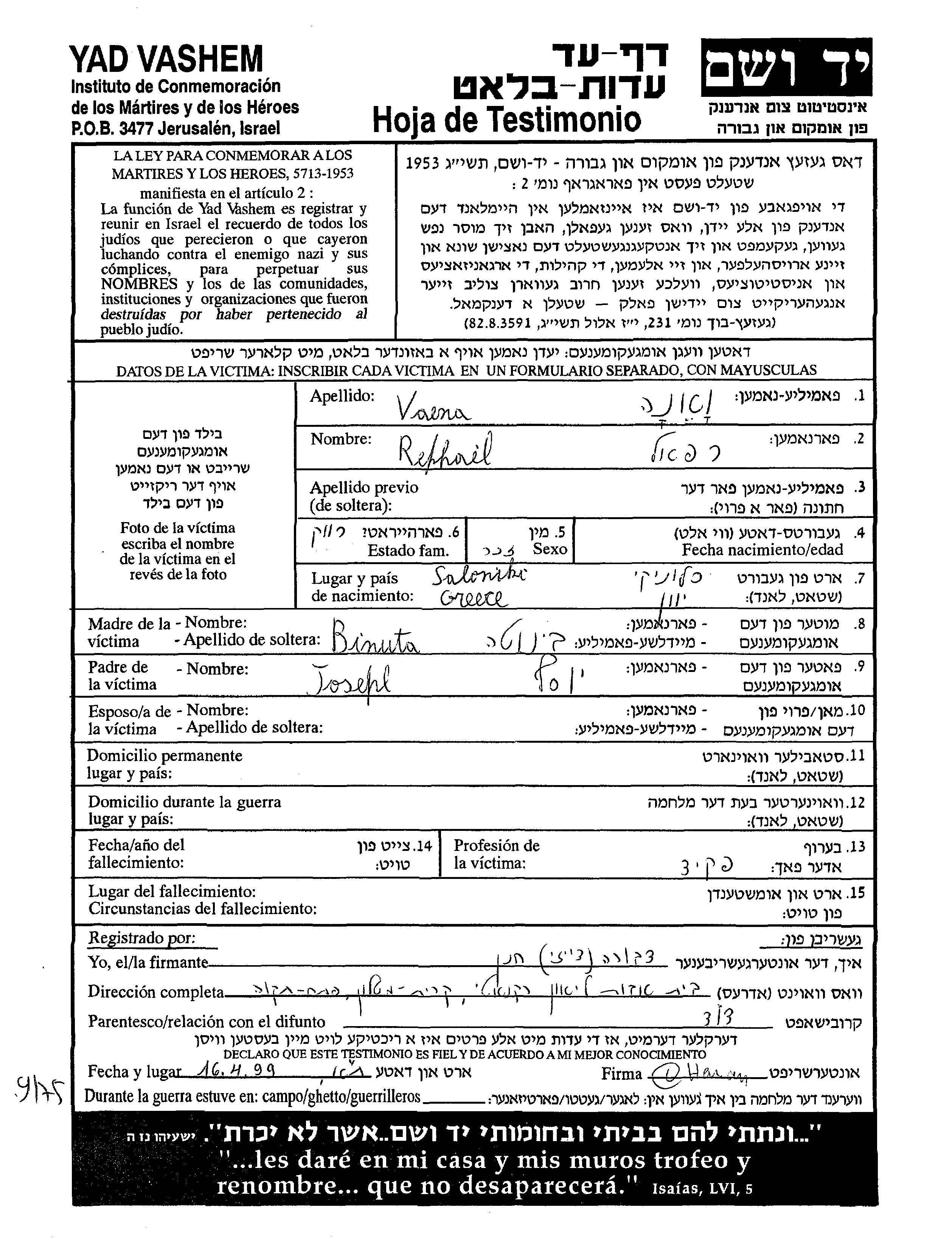 Refael Vaina wurde in Salonico, Griechenland geboren. Er war der Sohn von Josep und Binuta. Er war Angestellte/-r und Ledig.