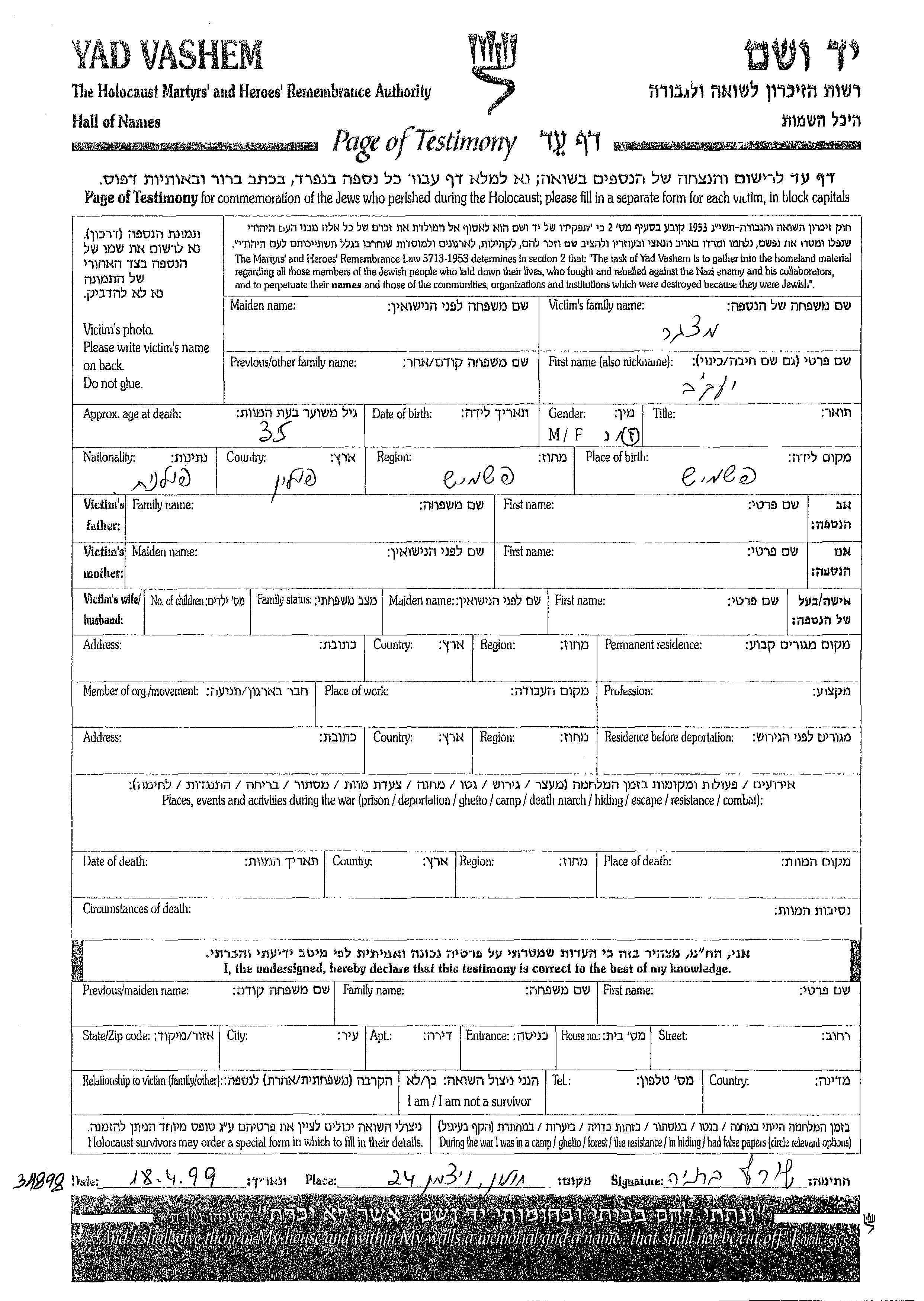 Metzger Yaakov unbekannter Ort, Gedenkblatt