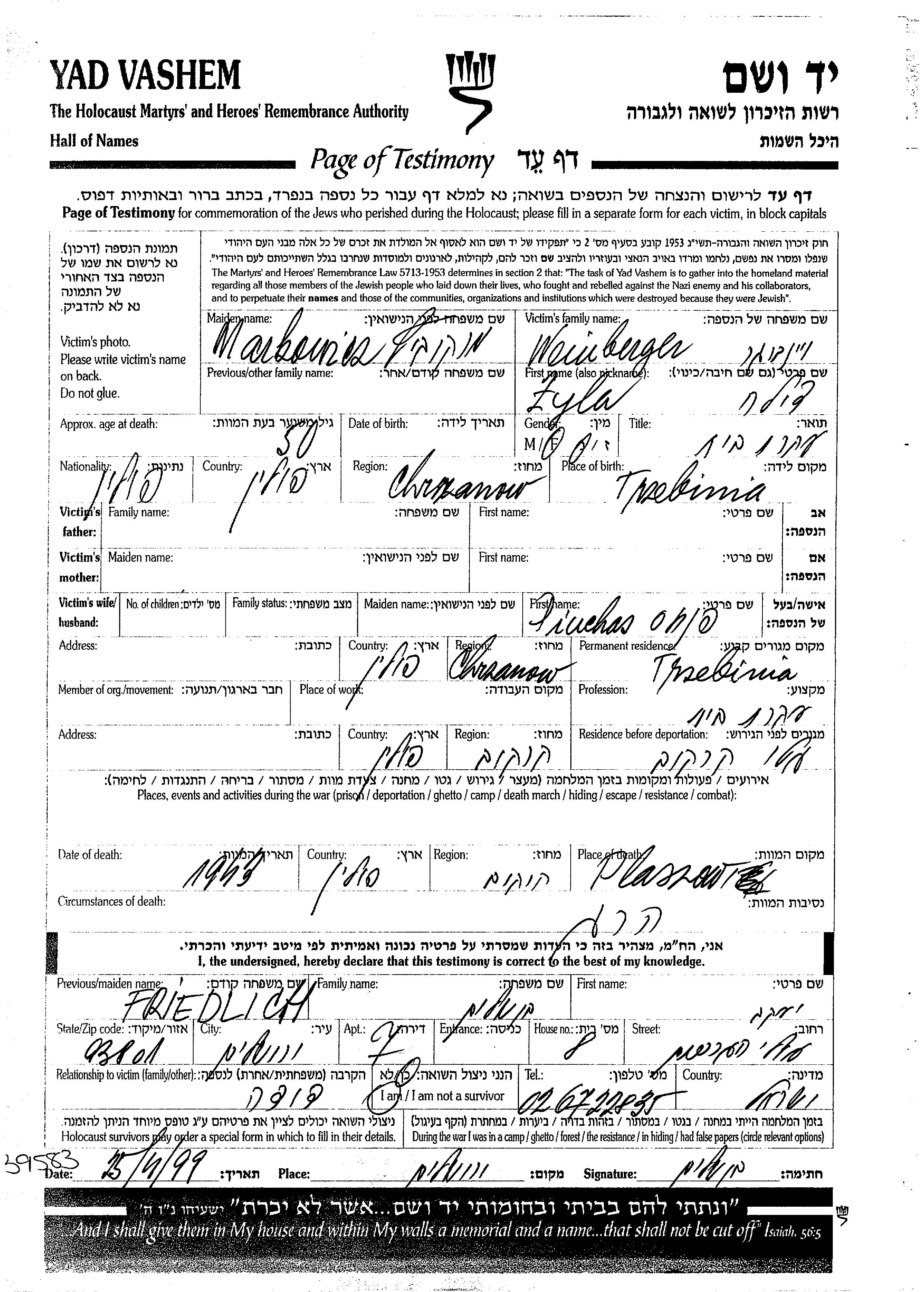 Zyla wurde in der Schoah ermordet. Todesort: Plaszow, Polen im Jahr 1943.