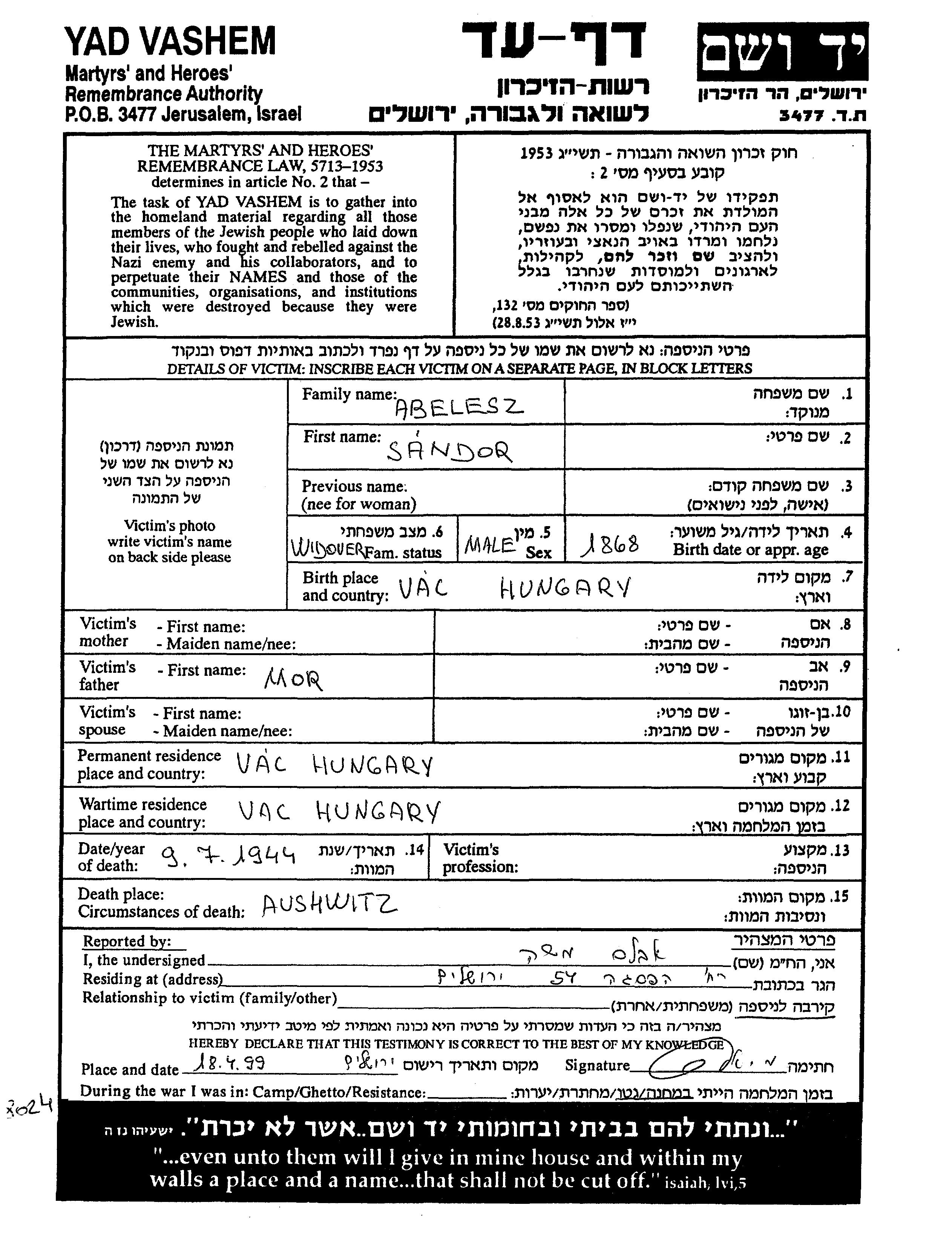 Sandor Abelesz wurde im Jahr 1868 in Vac, Ungarn geboren. Er war der Sohn von Mor. Er war Witwe. Vor dem Zweiten Weltkrieg lebte er in Vac, Ungarn. Während des Krieges war er in Vac, Ungarn.