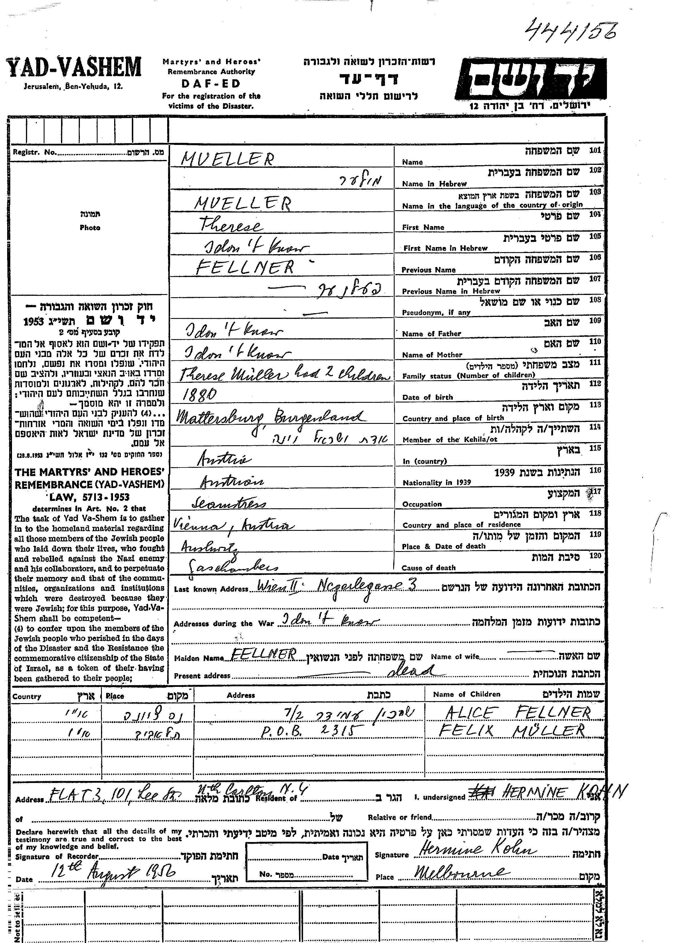 Therese Müller, geb. Fellner wurde im Jahr 1880 in Mattersburg, Österreich geboren. Sie war Schneiderin und Verheiratet. Vor dem Zweiten Weltkrieg lebte sie in Wien, Österreich. Während des Krieges war sie in Wien, Österreich.