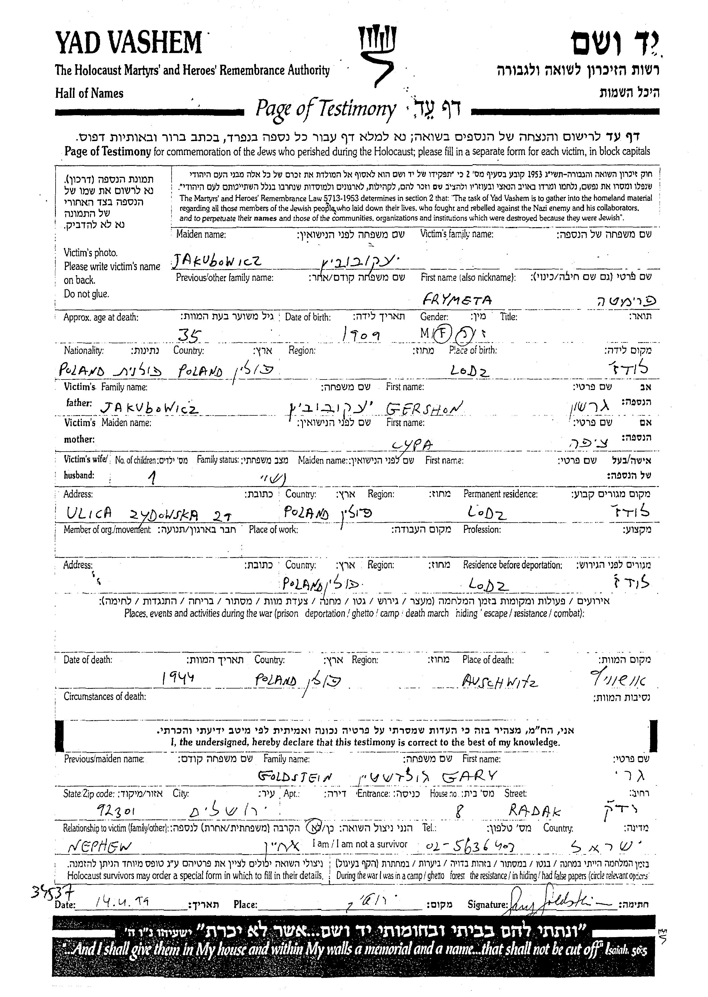 Frymeta Name unbekannt, geb. Jakubowicz wurde im Jahr 1909 in Lodz, Polen geboren. Sie war die Tochter von Gershon und Cypa. Sie war Verheiratet. Vor dem Zweiten Weltkrieg lebte sie in Lodz, Polen. Während des Krieges war sie in Lodz, Polen.