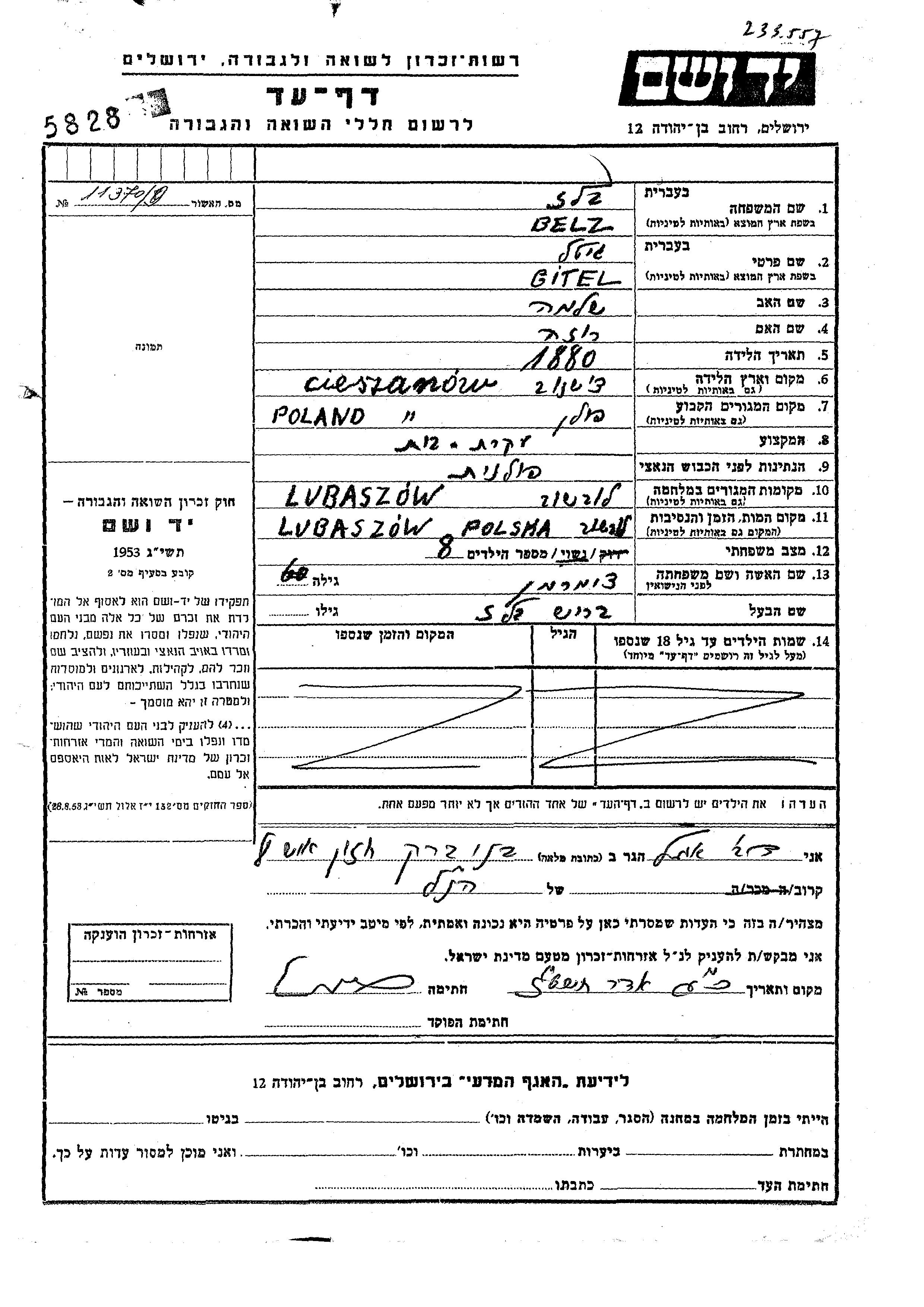 Gitel wurde in der Schoah ermordet. Todesort: Lubaczow, Polen.