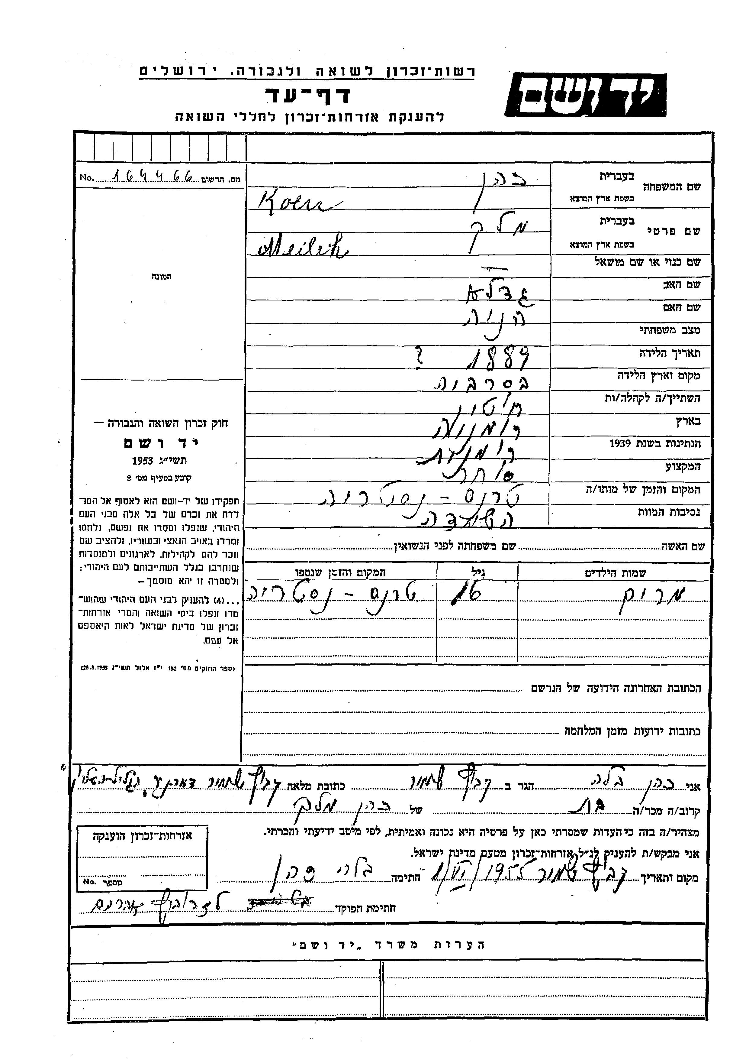 Meileh Koen wurde im Jahr 1889 in Bessarabia, Rumänien geboren. Er war der Sohn von Gedalia und Henia. Er war Kaufmann/-frau und Verheiratet. Vor dem Zweiten Weltkrieg lebte er in Hotin, Rumänien.