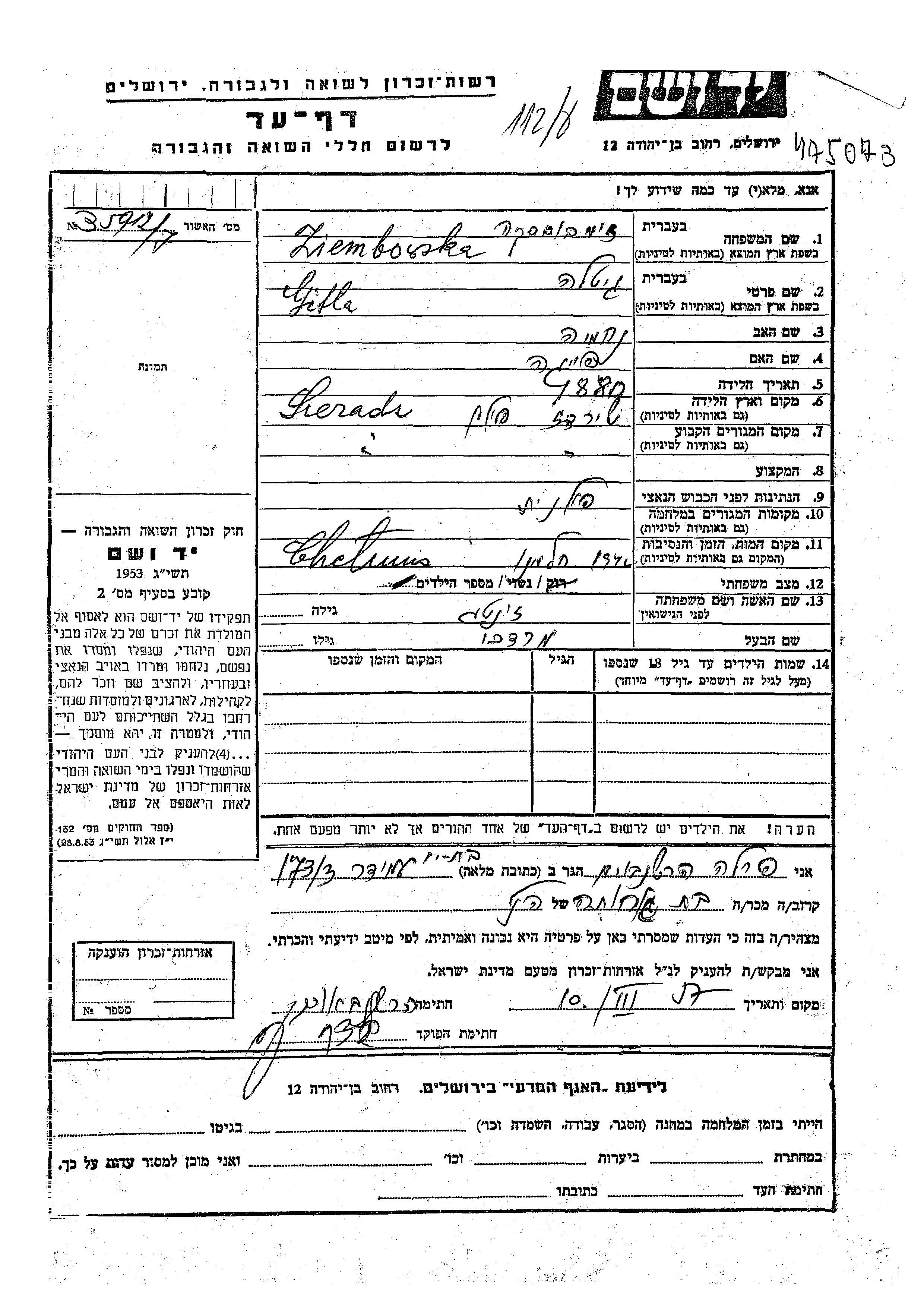 Gitla Ziembowska, geb. Zuntag wurde im Jahr 1880 in Sieradz, Polen geboren. Sie war die Tochter von Nekhemia und Feiga. Sie war mit Mordekhai Verheiratet. Vor dem Zweiten Weltkrieg lebte sie in Sieradz, Polen.