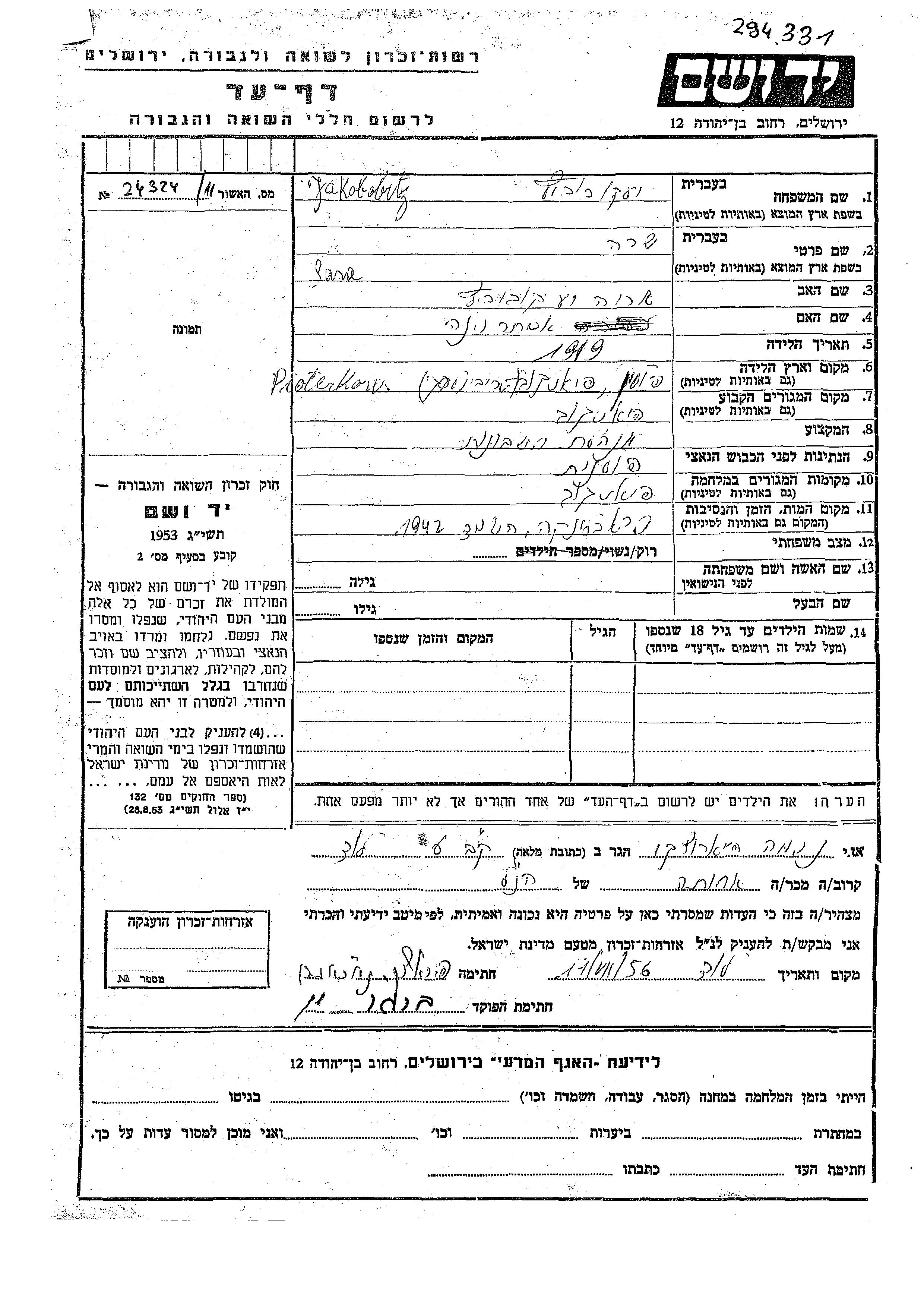 Sara Jakobowitz wurde im Jahr 1919 in Piotrkow, Polen geboren. Sie war die Tochter von Arie und Ester Vina. Sie war Buchhalter/-in und Ledig. Vor dem Zweiten Weltkrieg lebte sie in Piotrkow, Polen. Während des Krieges war sie in Piotrkow, Polen.