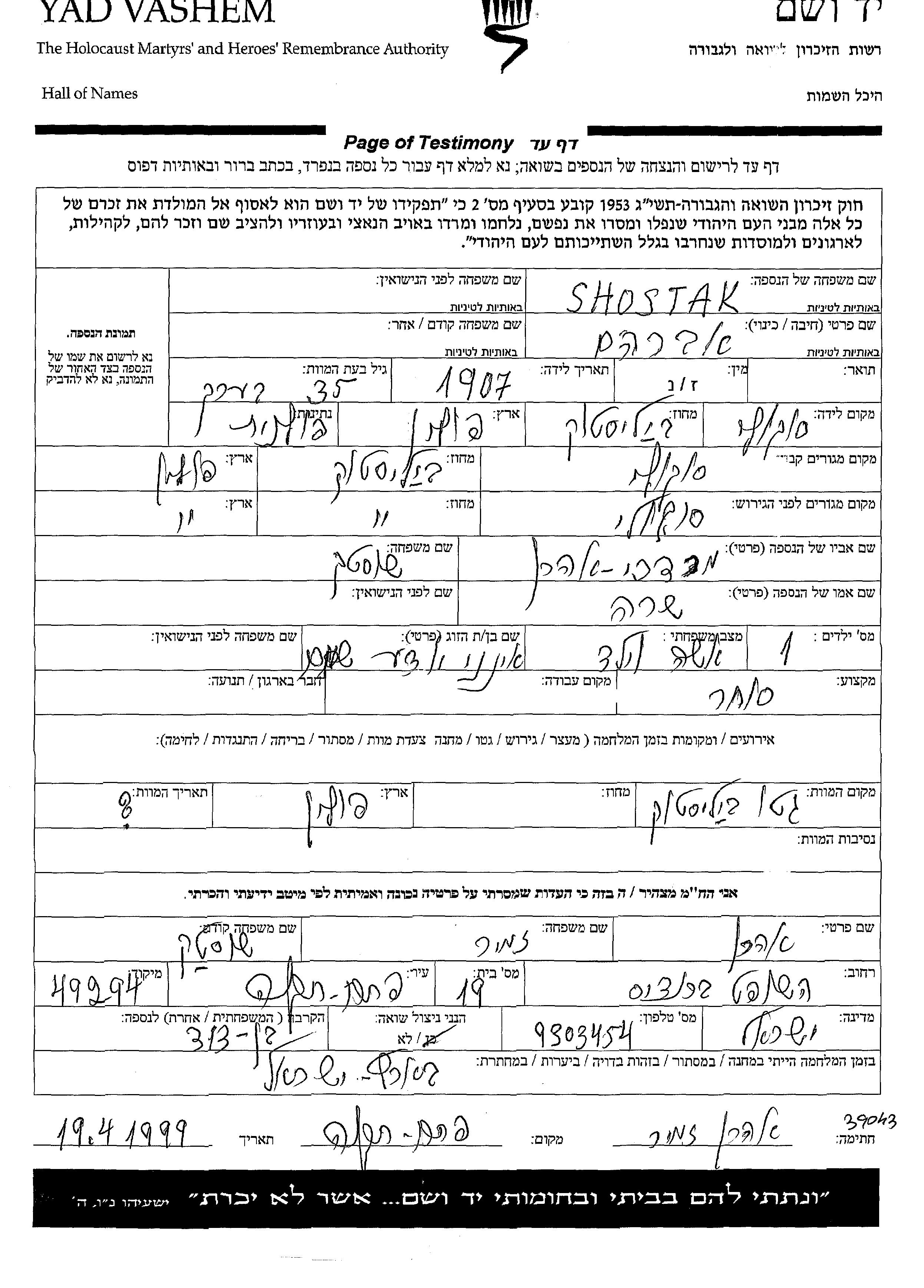Avraham Shostak wurde im Jahr 1907 in Sokoli, Polen geboren. Er war der Sohn von Mordekhai Aharon und Sara. Er war Kaufmann/-frau und Verheiratet. Vor dem Zweiten Weltkrieg lebte er in Sokoli, Polen. Während des Krieges war er in Sokoli, Polen.