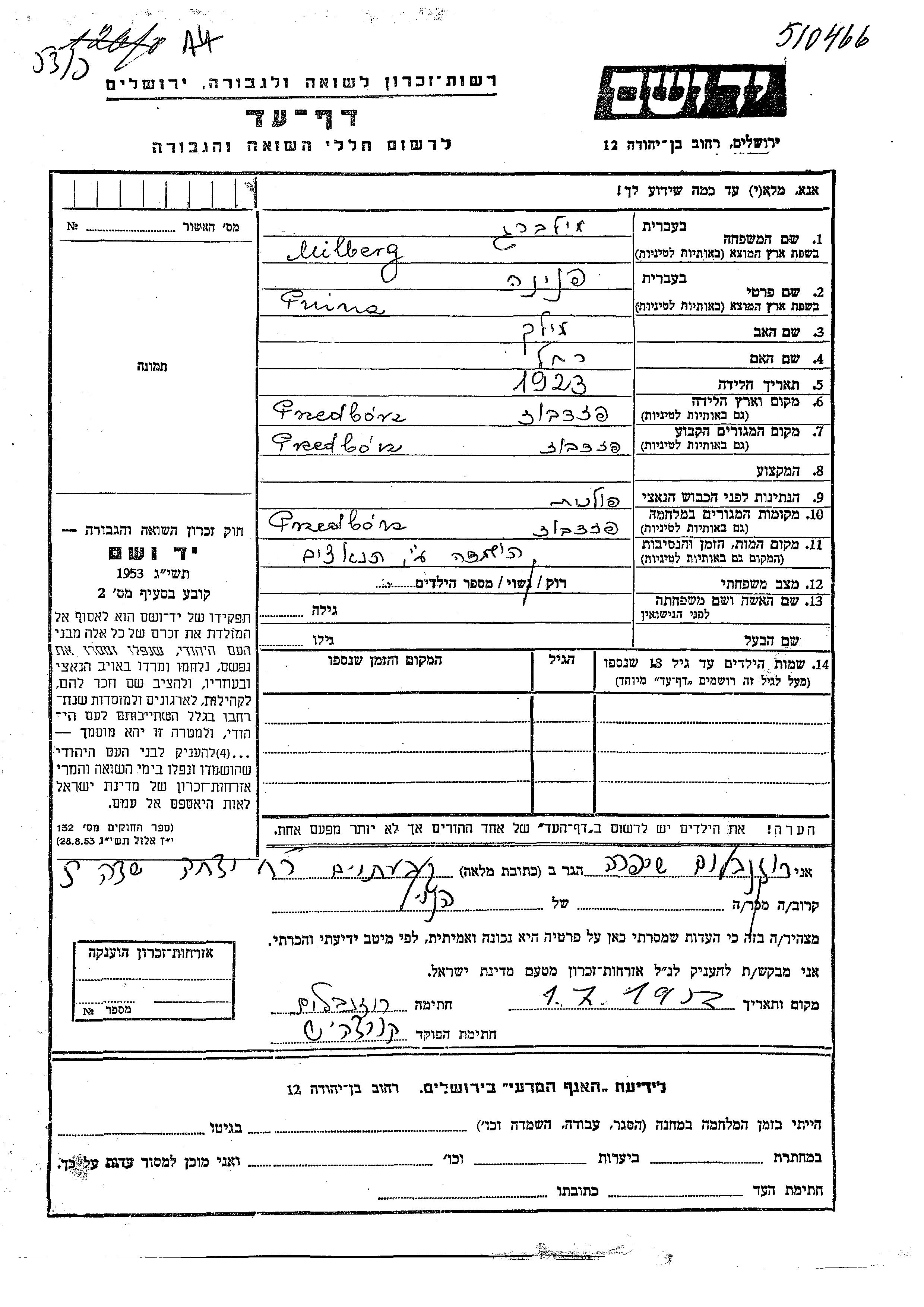 Milberg Pnina 1923 Przedborz, Polen Gedenkblatt