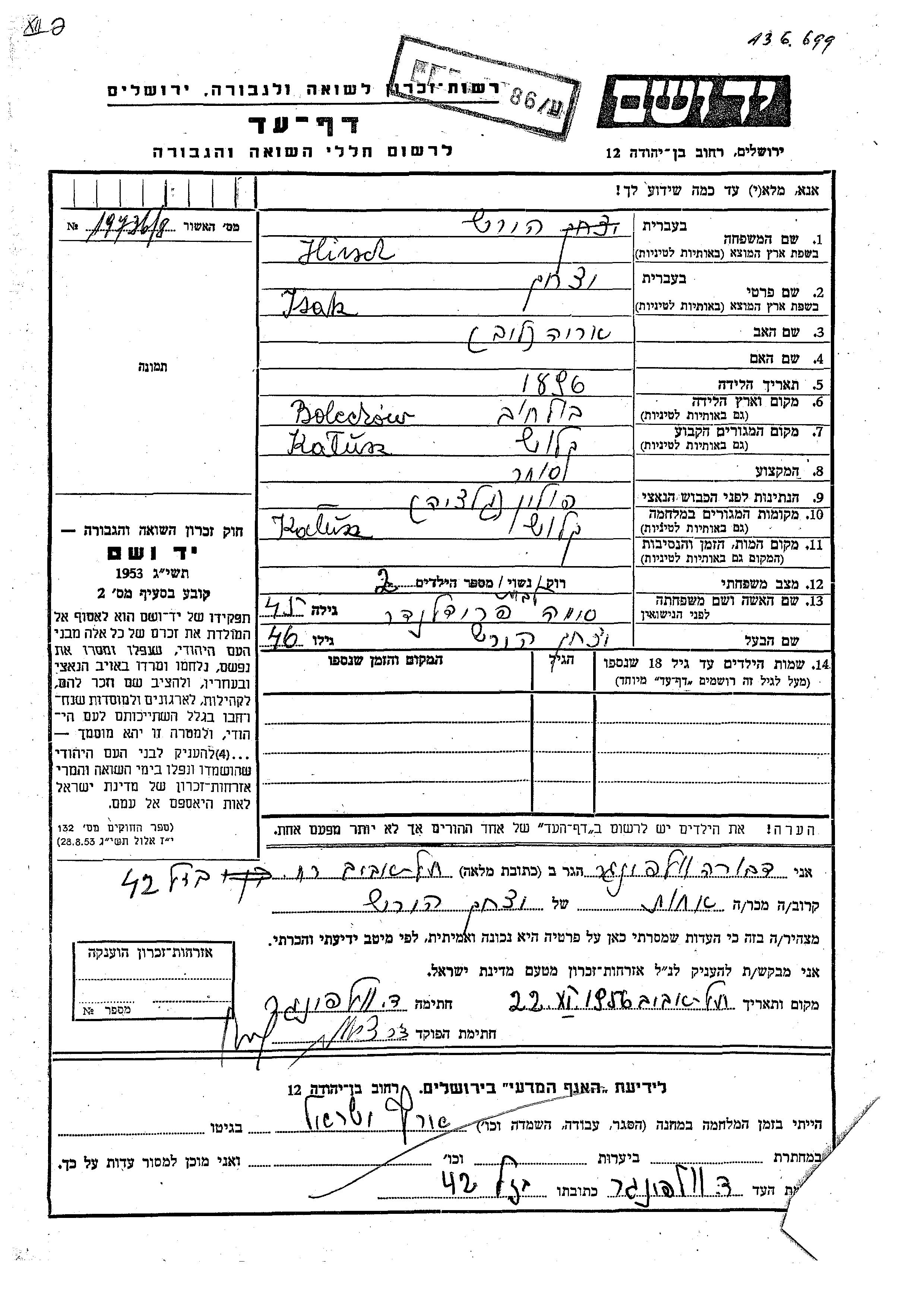 Isak Hirsch wurde im Jahr 1896 in Bolechow, Polen geboren. Er war der Sohn von Arie Leib. Er war Kaufmann/-frau und mit Sima, geb. Fridlender Verheiratet. Vor dem Zweiten Weltkrieg lebte er in Kalusz, Polen. Während des Krieges war er in Kalusz, Polen.