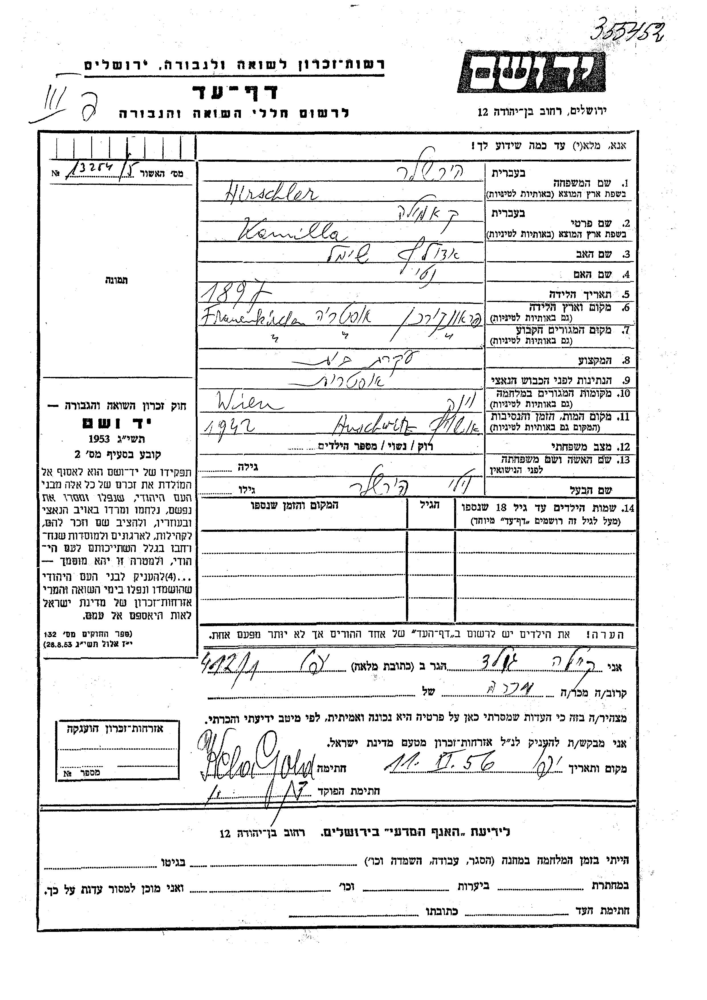 Kamilla wurde in der Schoah ermordet. Todesort: Auschwitz, Polen im Jahr 1942.