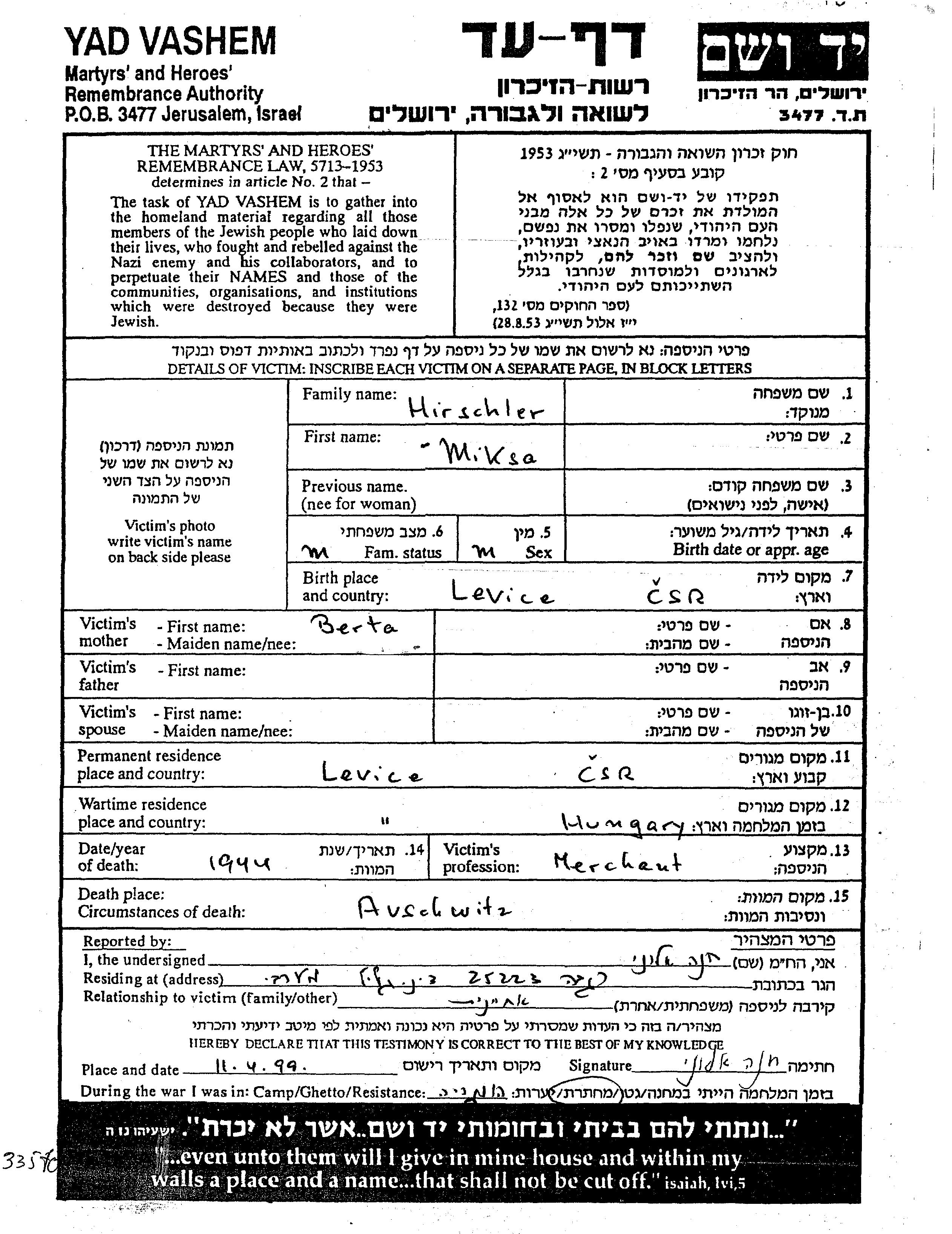 Miksa wurde in der Schoah ermordet. Todesort: Auschwitz, Polen im Jahr 1944.