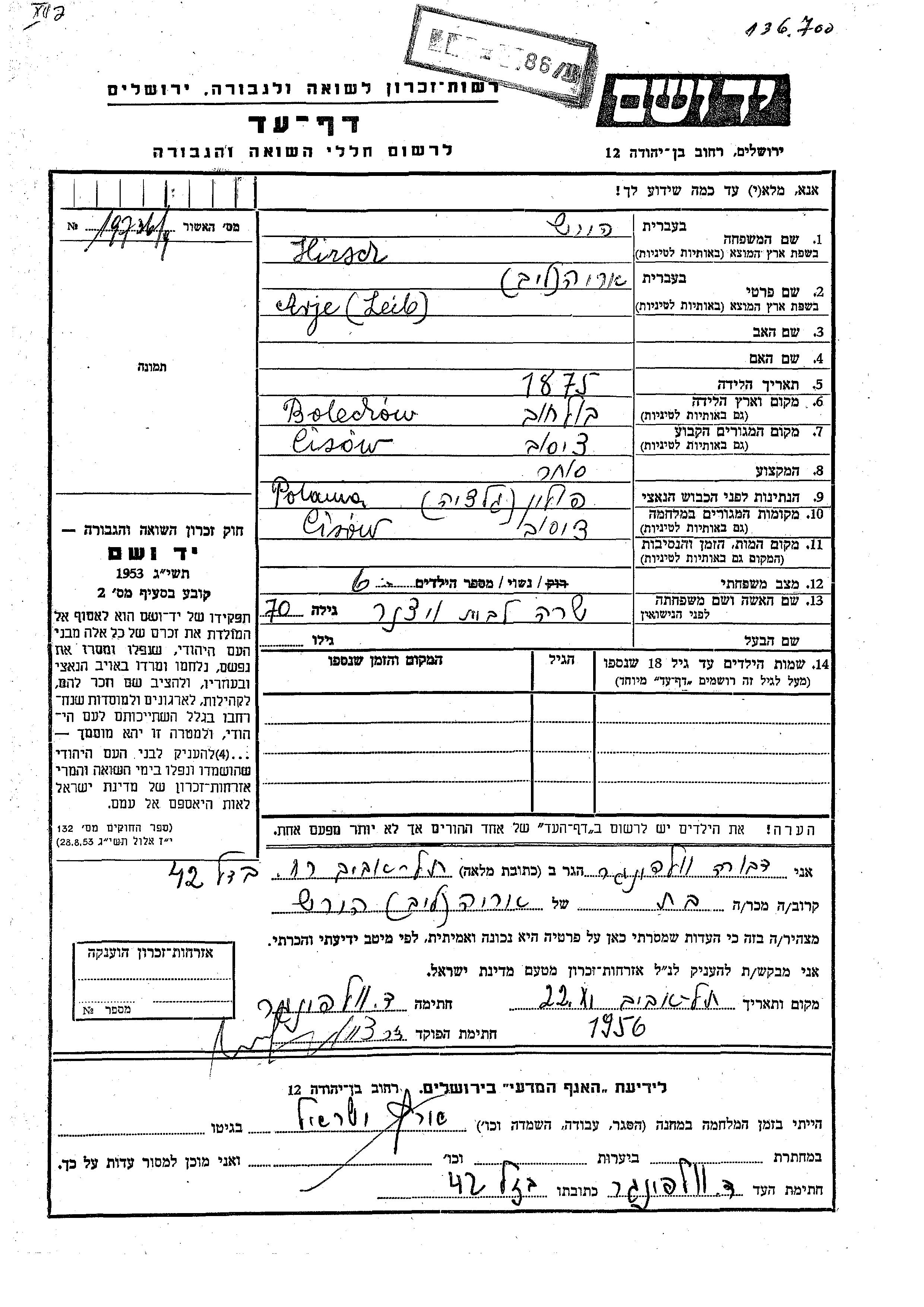 Arje Leib Hirsch wurde im Jahr 1875 in Bolechow, Polen geboren. Er war Kaufmann/-frau und mit Sara, geb. Vitzner Verheiratet. Vor dem Zweiten Weltkrieg lebte er in Cisow, Polen. Während des Krieges war er in Galizien Region, Polen.