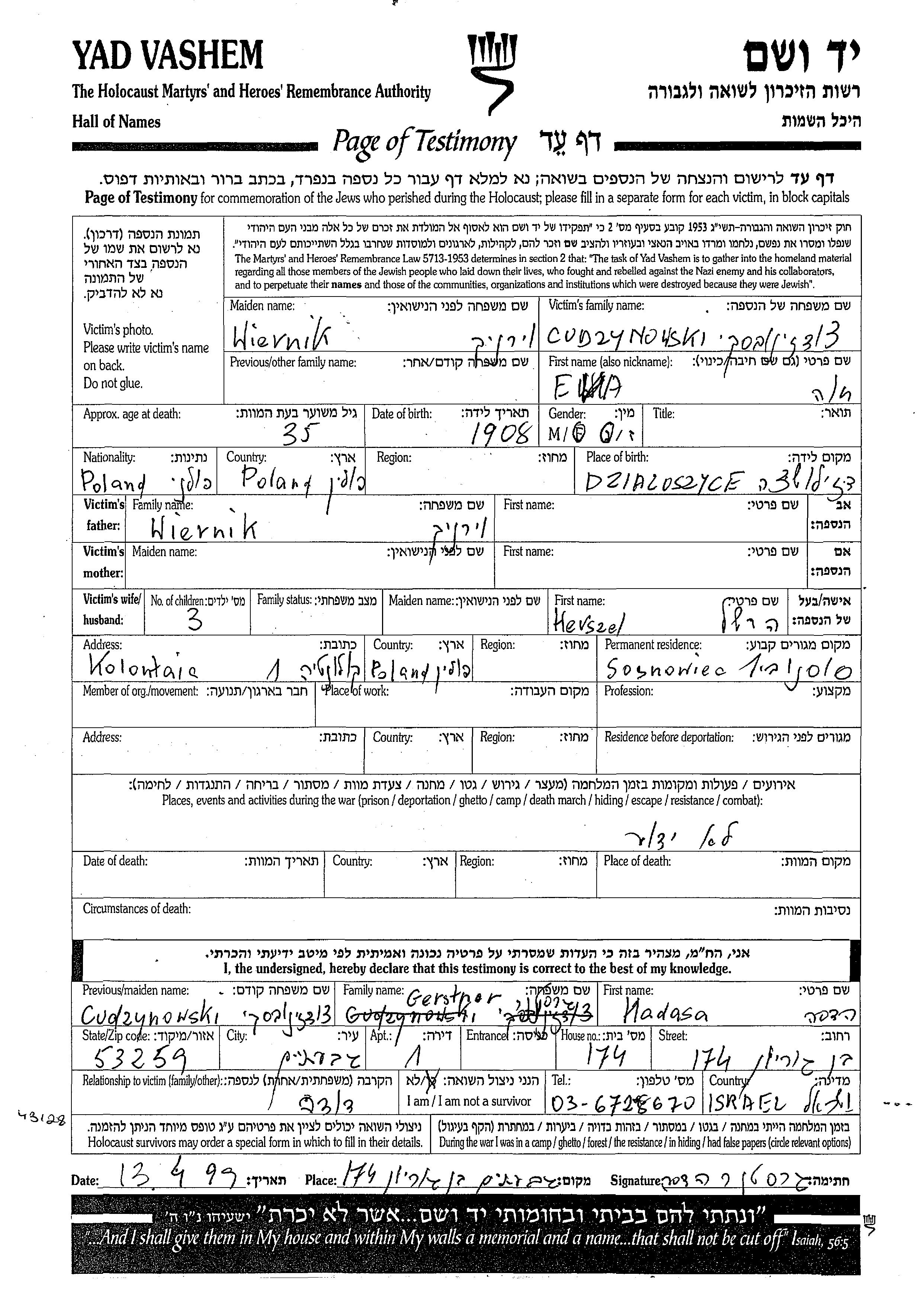 Eva Khava Cudzynowski, geb. Wiernik Virnyk wurde im Jahr 1908 in Dzialoszyce, Polen geboren. Sie war mit Herszel Verheiratet. Vor dem Zweiten Weltkrieg lebte sie in Sosnowce, Polen.