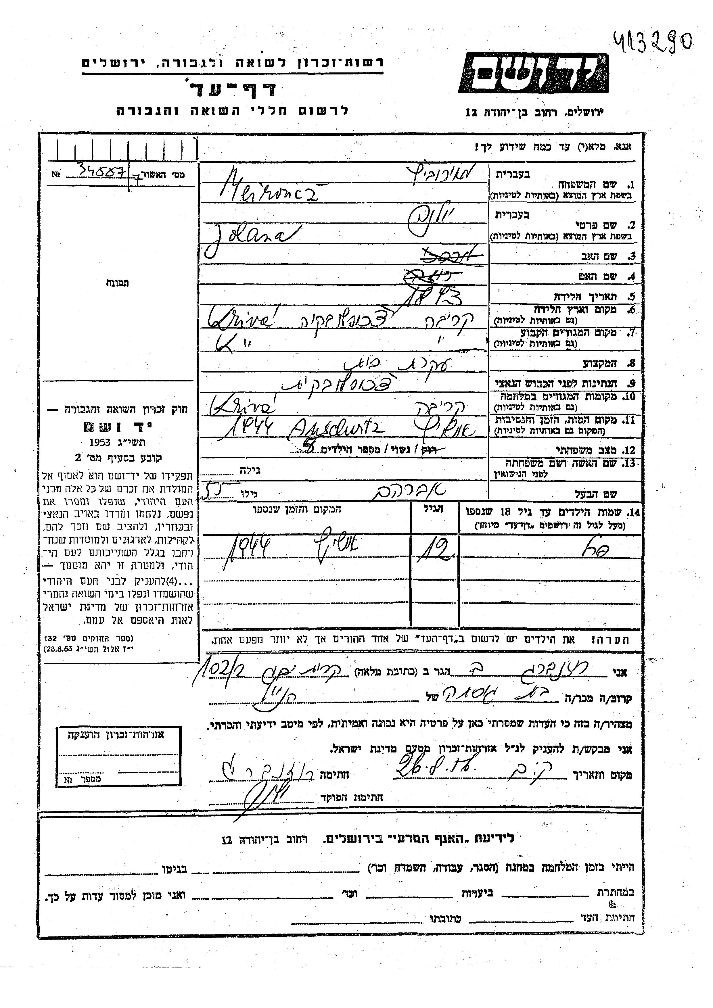 Jolana Meirovicz wurde im Jahr 1893 in Krive, Tschechoslowakei geboren. Sie war die Tochter von Mordekhai und Roza. Sie war Hausfrau und mit Avraham Verheiratet. Vor dem Zweiten Weltkrieg lebte sie in Krive, Tschechoslowakei. Während des Krieges war sie in Krive, Tschechoslowakei.