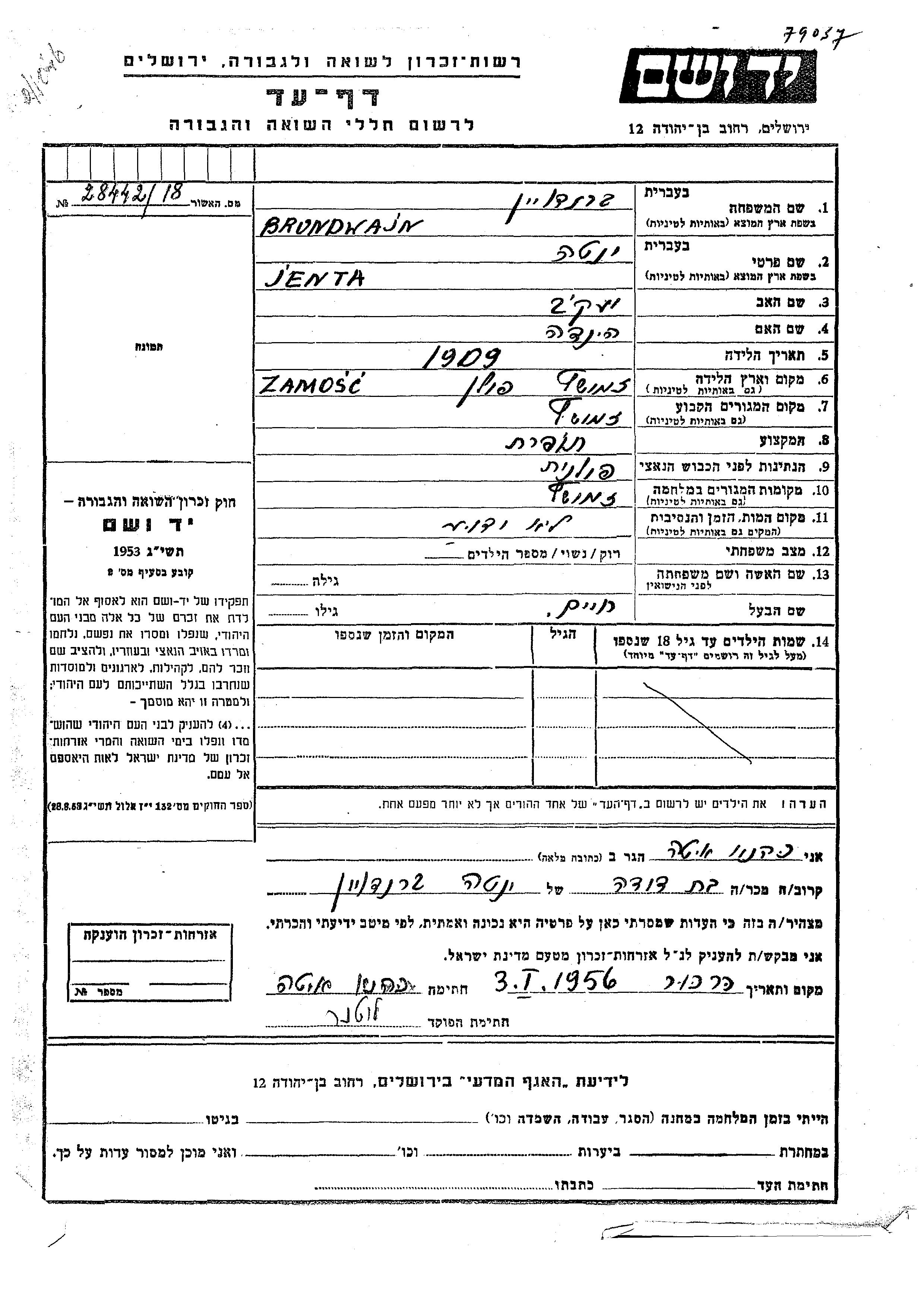 Jenta Brondwajn wurde im Jahr 1909 in Zamosc, Polen geboren. Sie war die Tochter von Yaakov und Hinda. Sie war Schneiderin und mit Khaim Verheiratet. Vor dem Zweiten Weltkrieg lebte sie in Zamosc, Polen. Während des Krieges war sie in Zamosc, Polen.