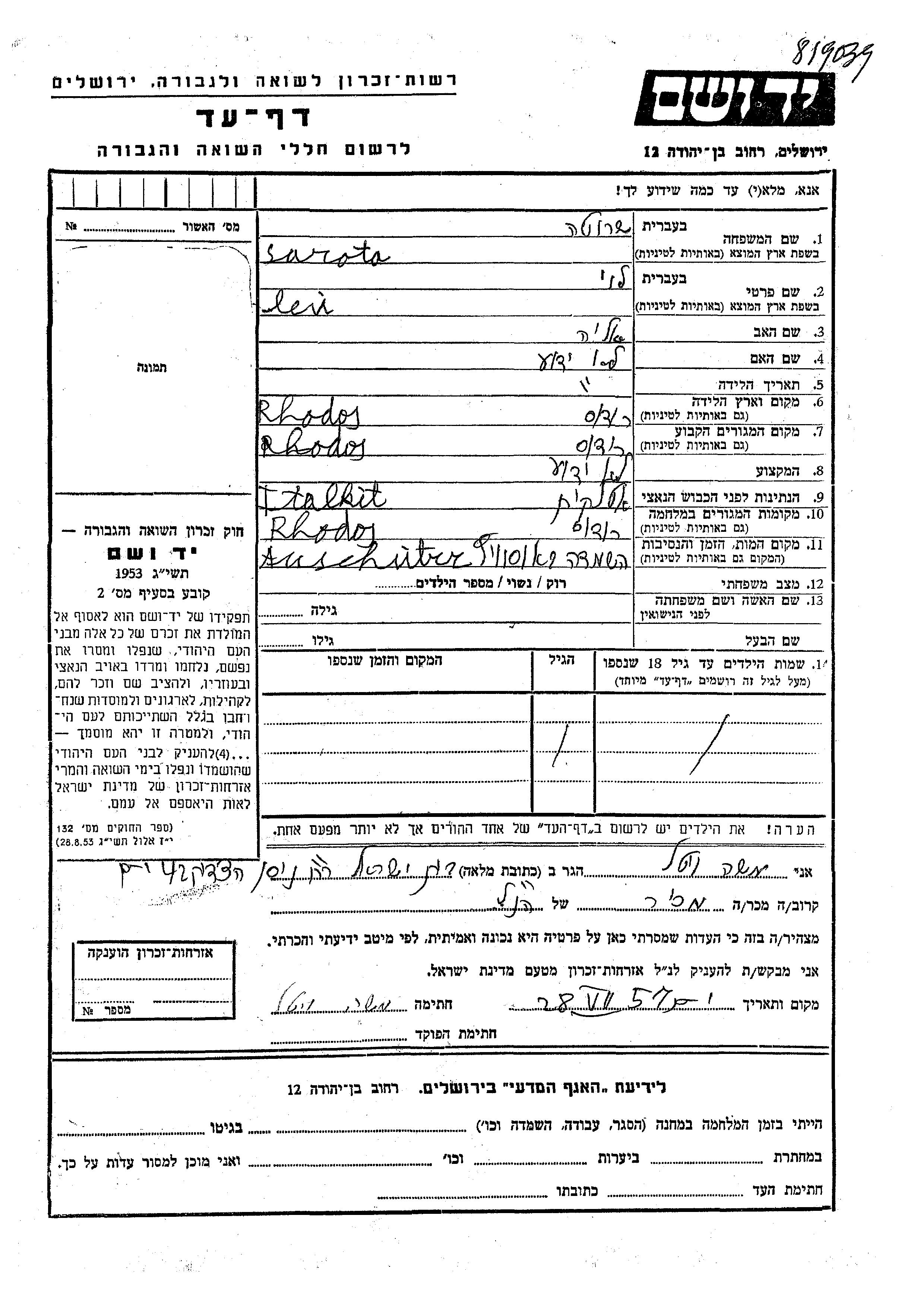 Levi wurde in der Schoah ermordet. Todesort: Auschwitz, Polen.