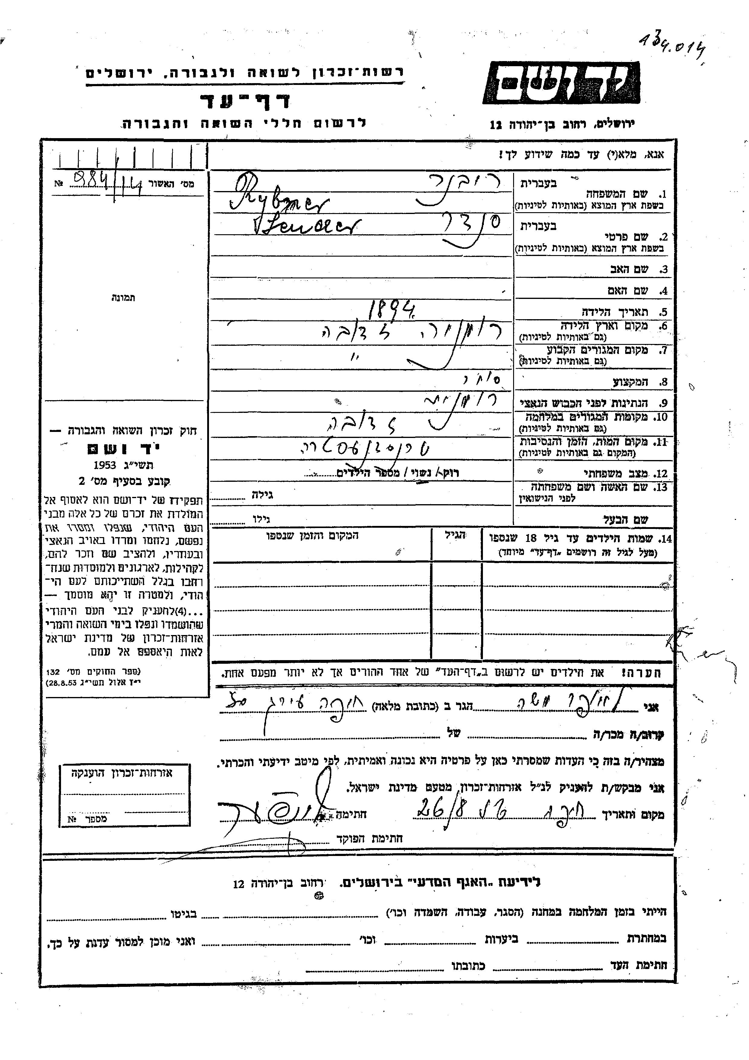 Sender Rybner wurde im Jahr 1894 in Zadowa, Rumänien geboren. Er war Kaufmann/-frau und Verheiratet. Vor dem Zweiten Weltkrieg lebte er in Zadowa, Rumänien. Während des Krieges war er in Zadowa, Rumänien.