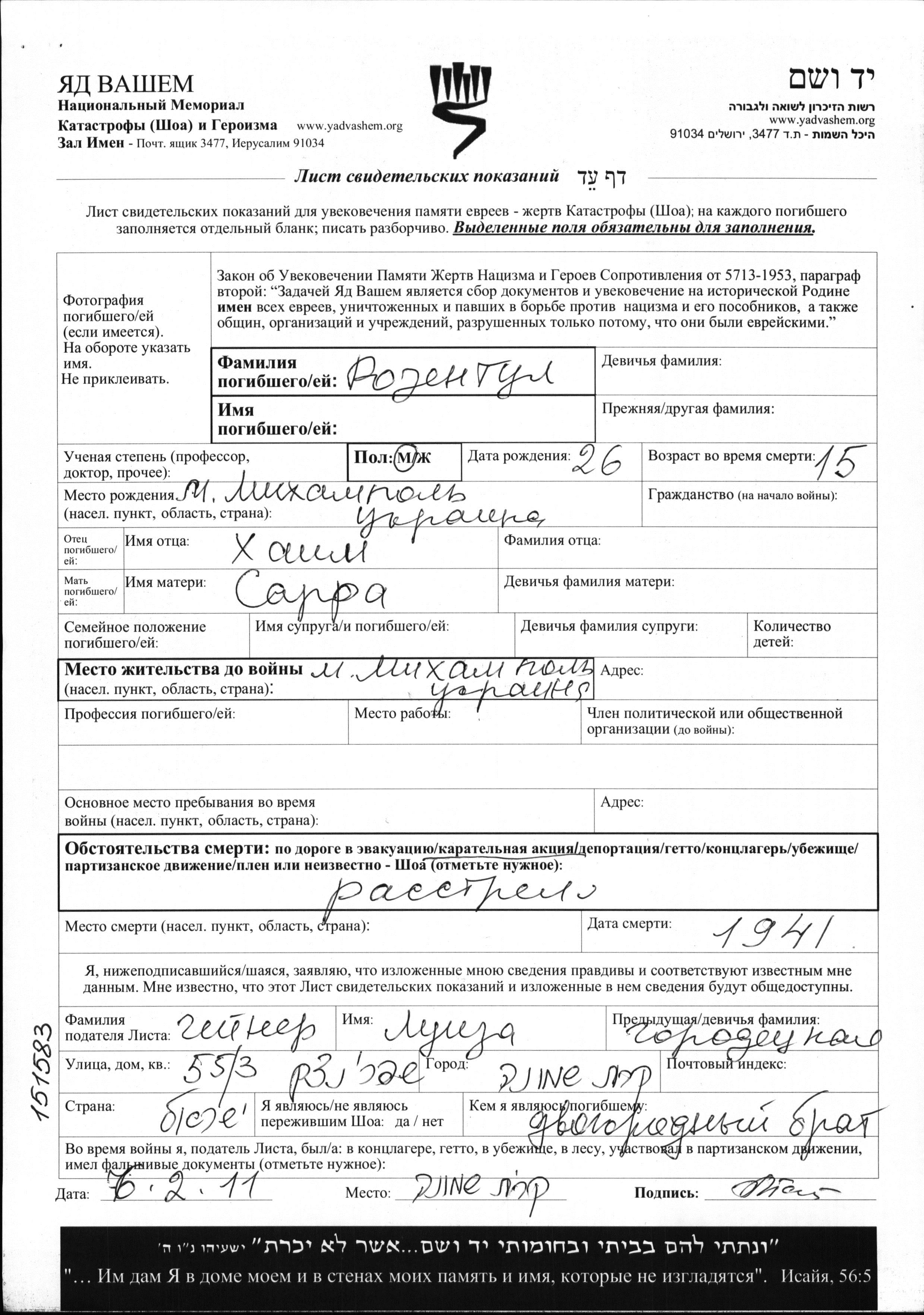 Rozentul Vorname unbekannt 1926 Mikhampol, Ukraine (UdSSR) Gedenkblatt