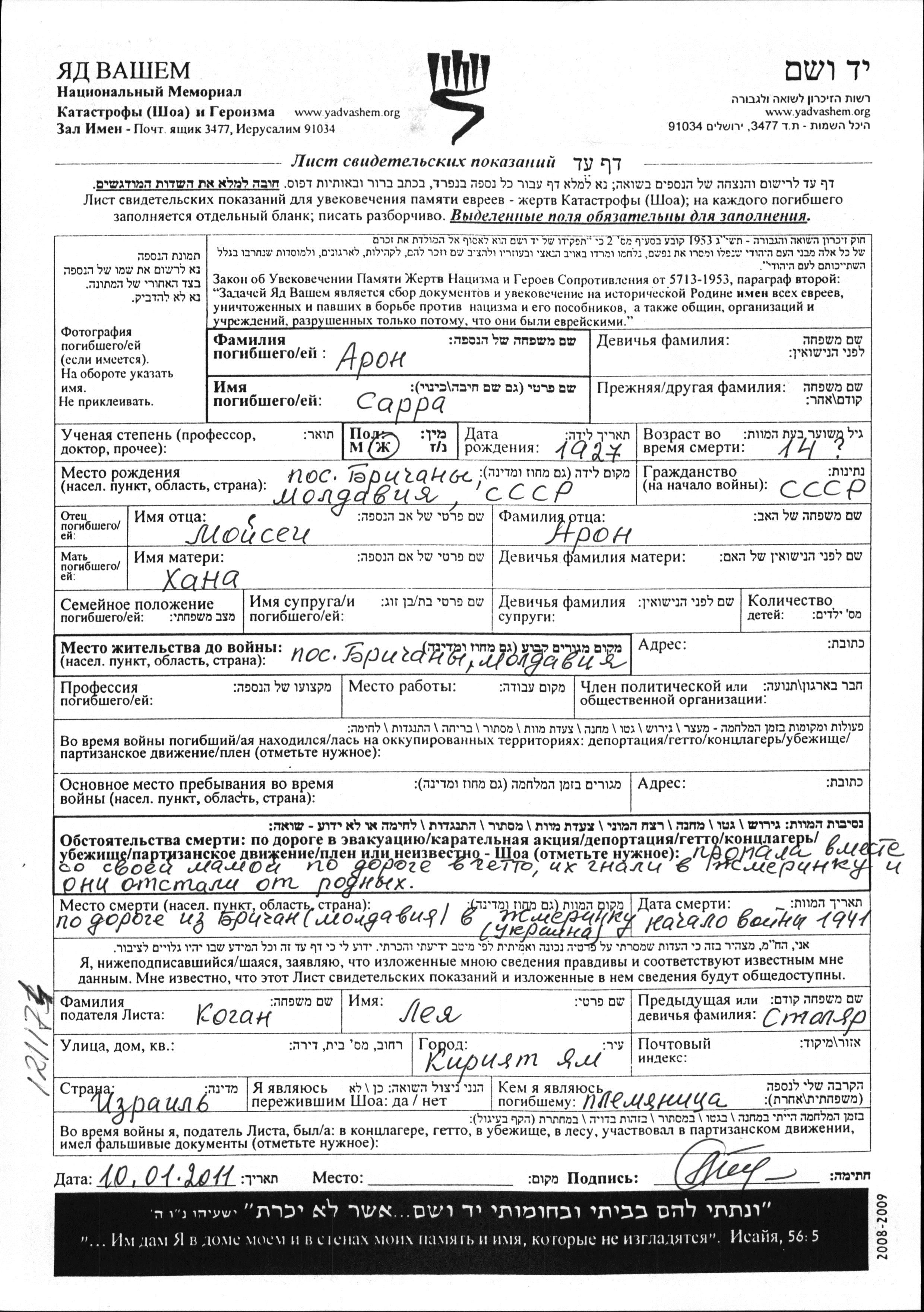 Sarra Aron wurde im Jahr 1927 in Bricheni, Rumänien geboren. Sie war die Tochter von Moisei und Khana. Sie war Schüler/-in und Jugendliche/-r. Vor dem Zweiten Weltkrieg lebte sie in Bricheni, Rumänien. Während des Krieges war sie in Bricheni, Rumänien.