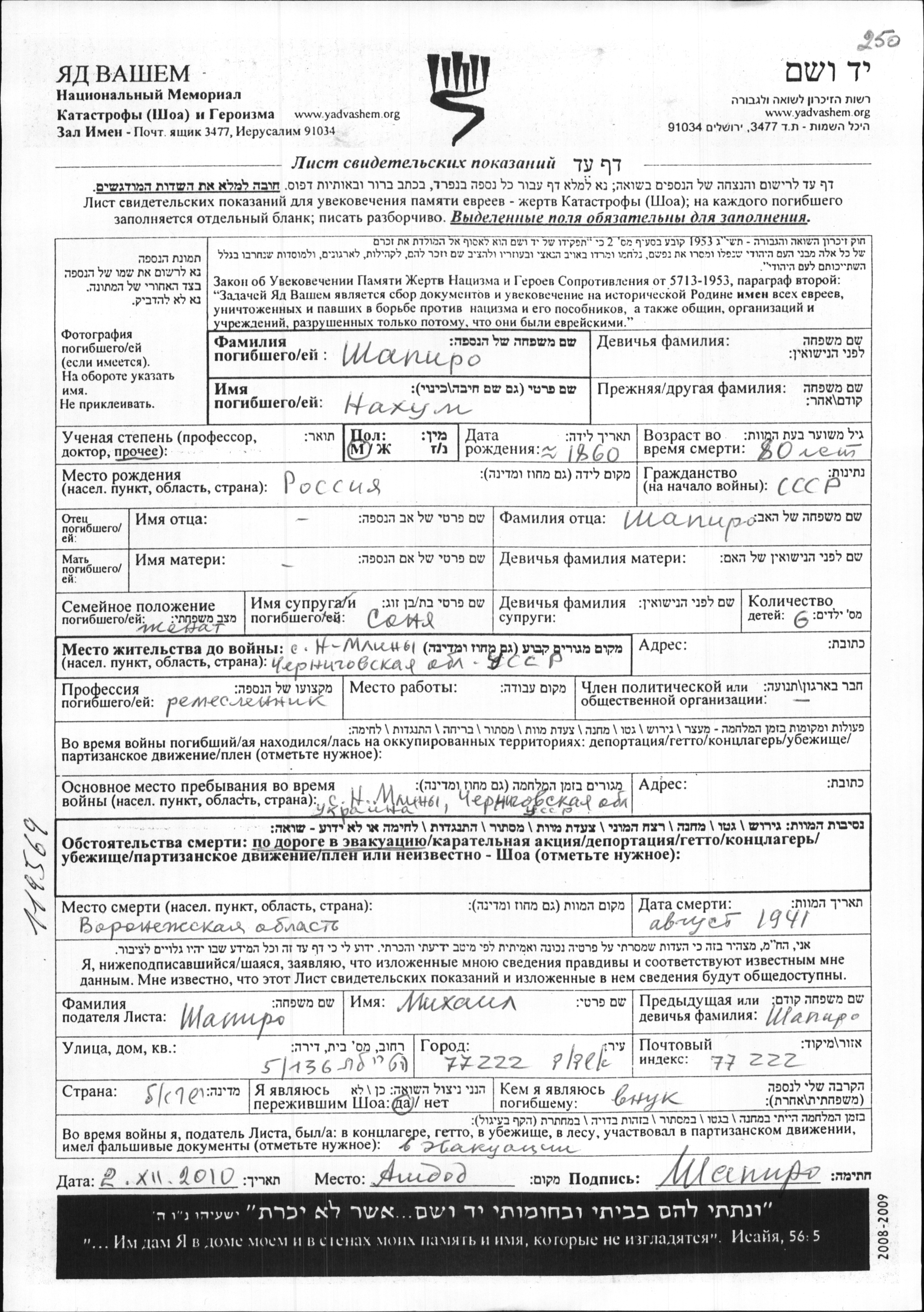 Nakhum Shapiro wurde im Jahr 1860 in Russisches Kaiserreich geboren. Er war Handwerker und mit Sonya Verheiratet. Vor dem Zweiten Weltkrieg lebte er in Novyye Mliny, Ukraine (UdSSR). Während des Krieges war er in Novyye Mliny, Ukraine (UdSSR).