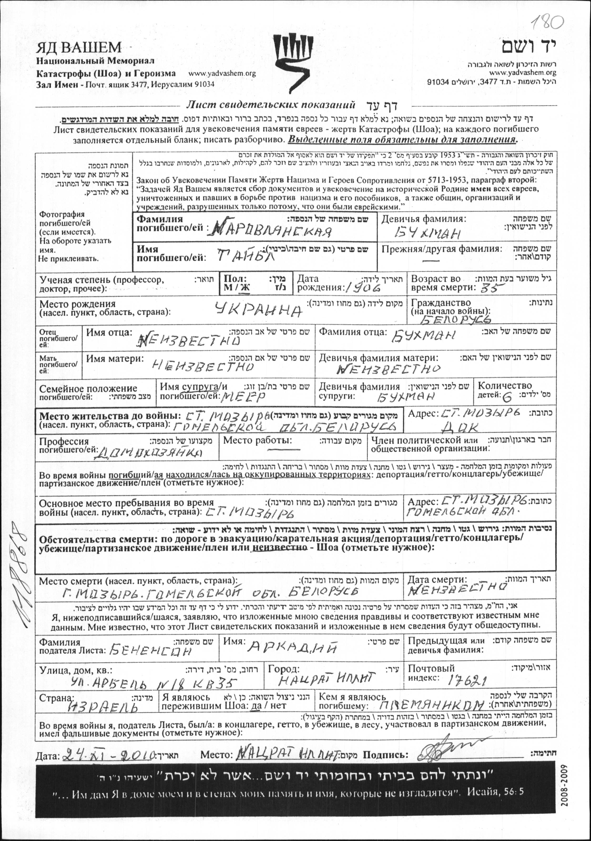Taibl Narovlyanskaya, geb. Bukhman wurde im Jahr 1906 in Ukraine (UdSSR) geboren. Sie war Hausfrau und mit Meyer Verheiratet. Vor dem Zweiten Weltkrieg lebte sie in Mozyr, Weißrussland (UdSSR). Während des Krieges war sie in Mozyr, Weißrussland (UdSSR).