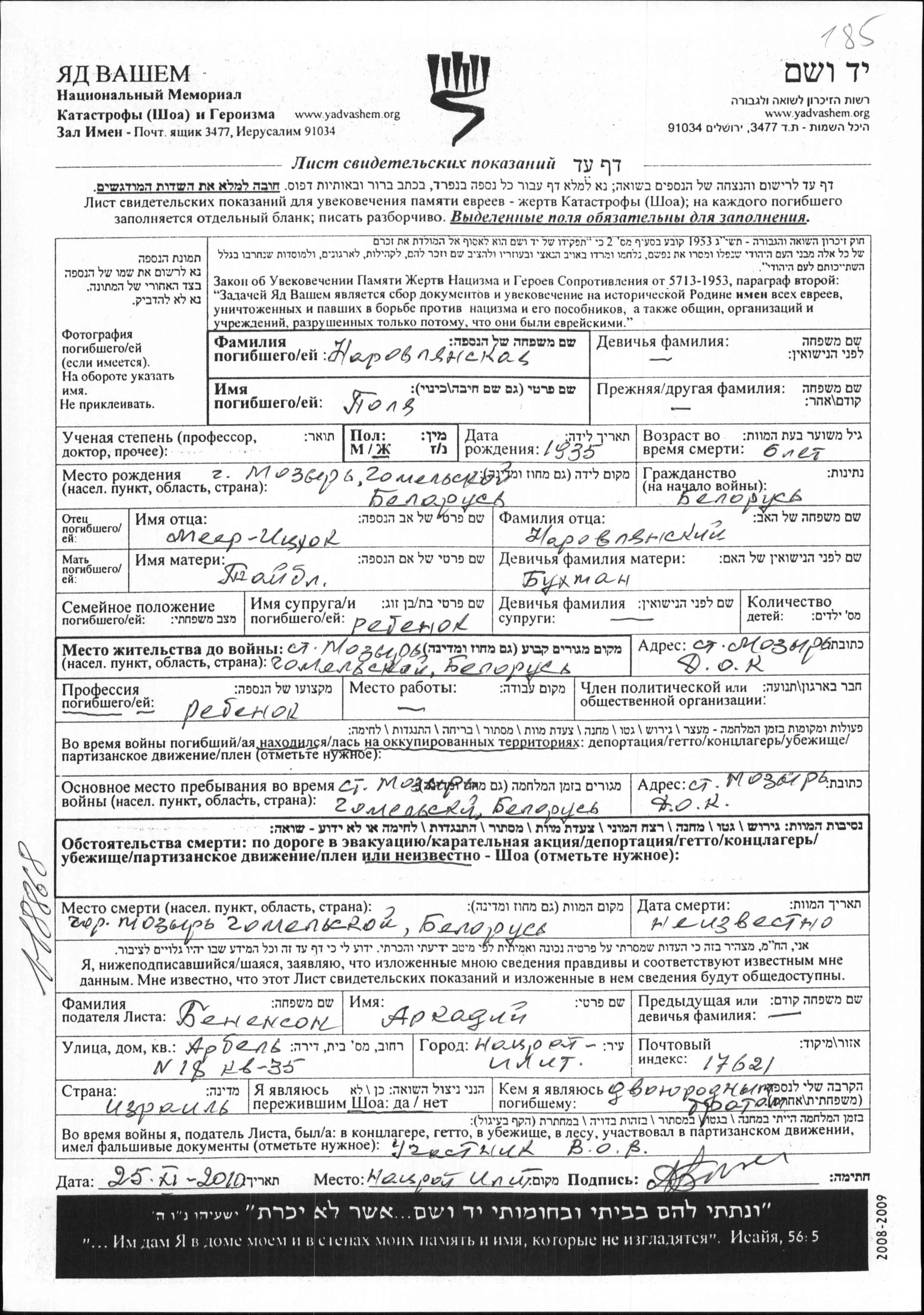 Polya Narovlyanskaya wurde im Jahr 1935 in Mozyr, Weißrussland (UdSSR) geboren. Sie war die Tochter von Meyer Itzkhok und Taybl, geb. Bukhman. Sie war Kind. Vor dem Zweiten Weltkrieg lebte sie in Mozyr, Weißrussland (UdSSR). Während des Krieges war sie in Mozyr, Weißrussland (UdSSR).