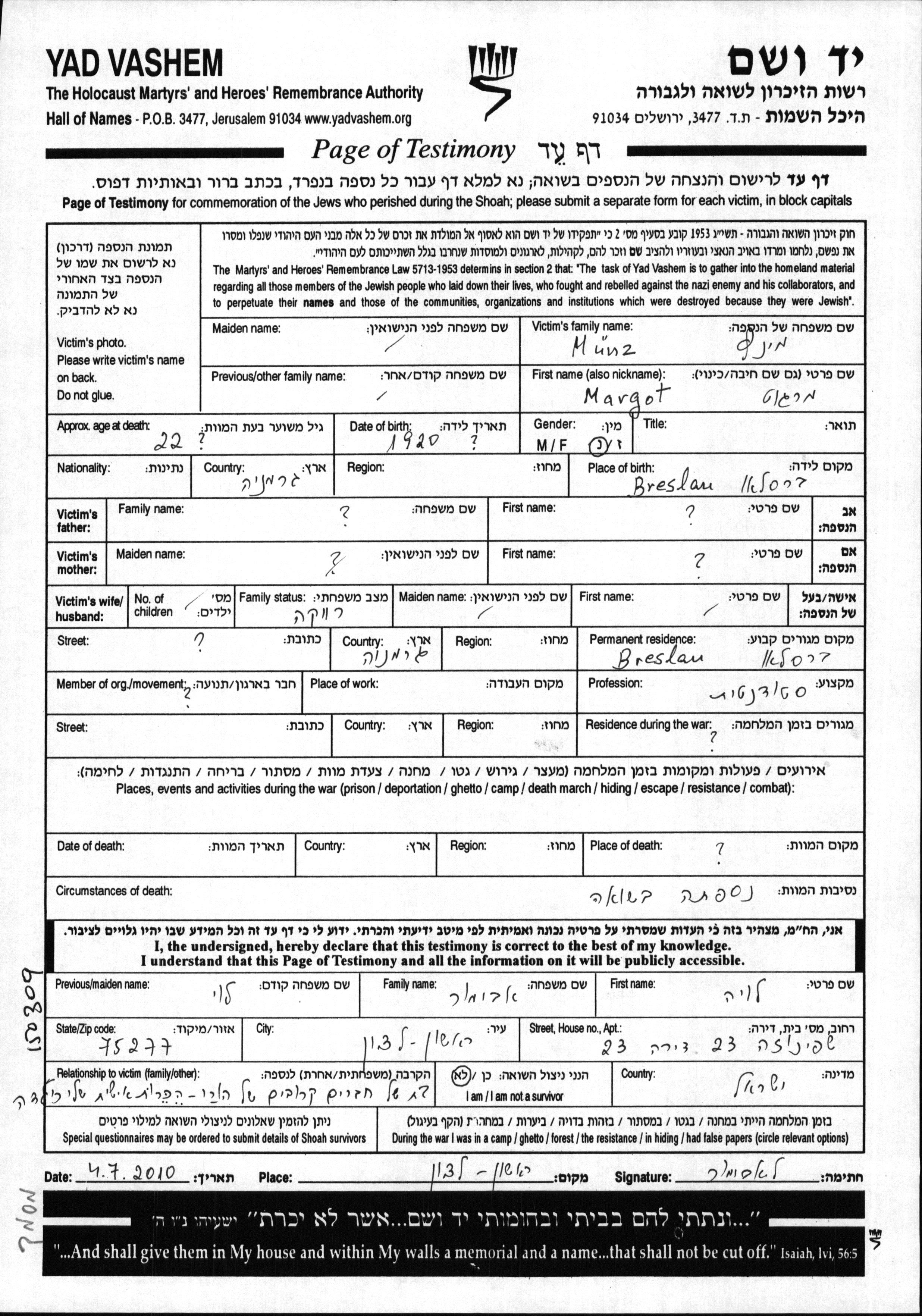 Margot Münz wurde im Jahr 1920 in Breslau, Deutsches Reich geboren. Sie war Student und Ledig. Vor dem Zweiten Weltkrieg lebte sie in Breslau, Deutsches Reich.